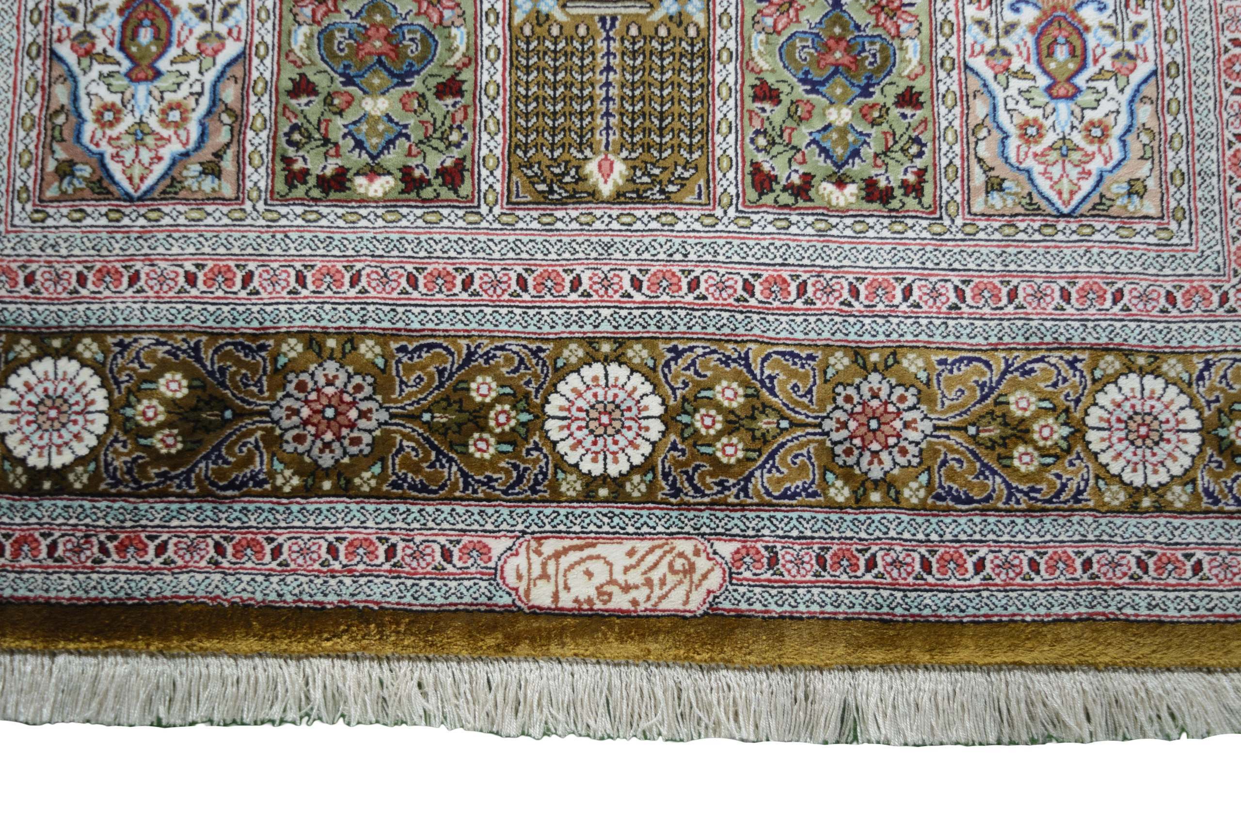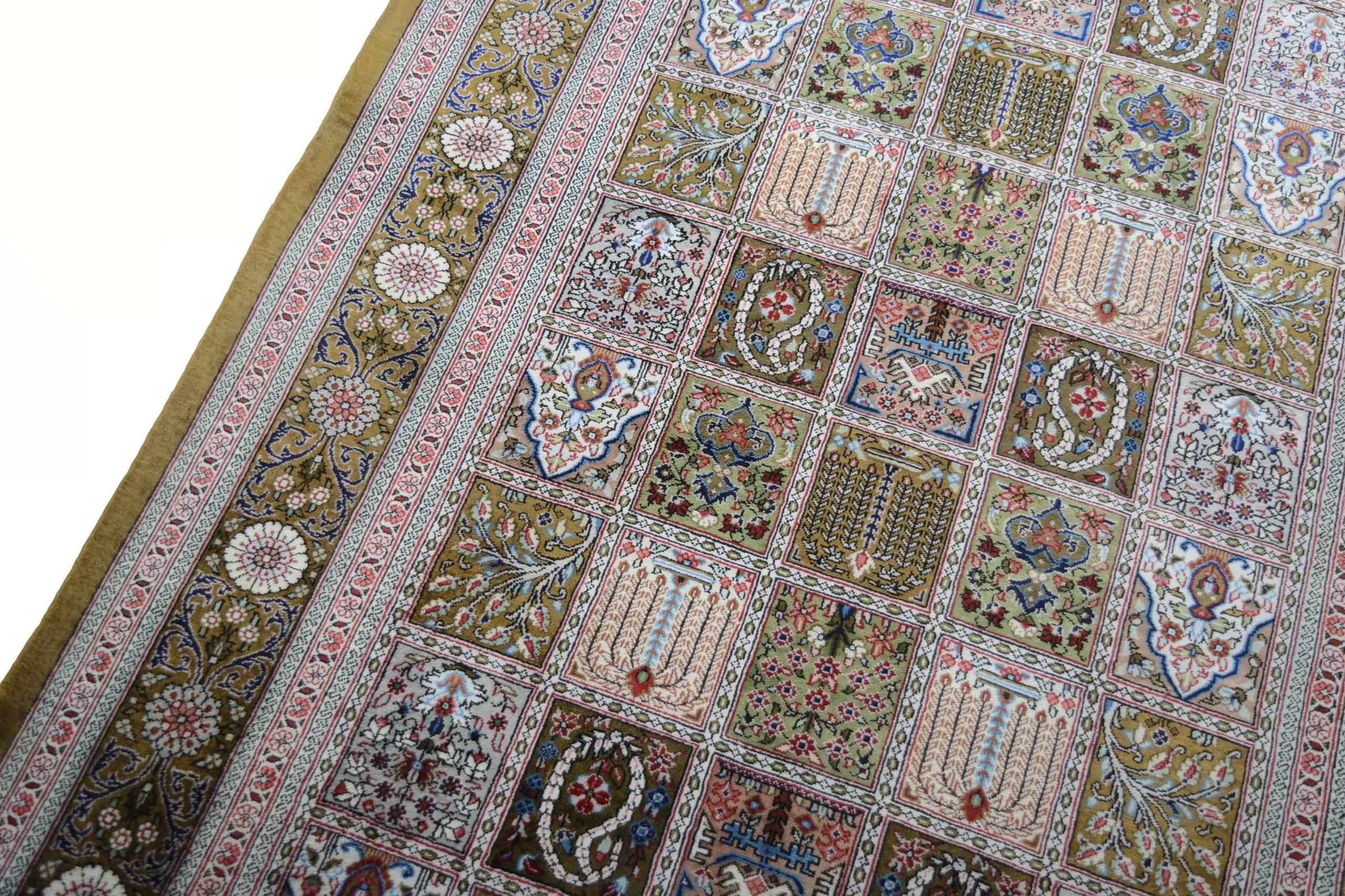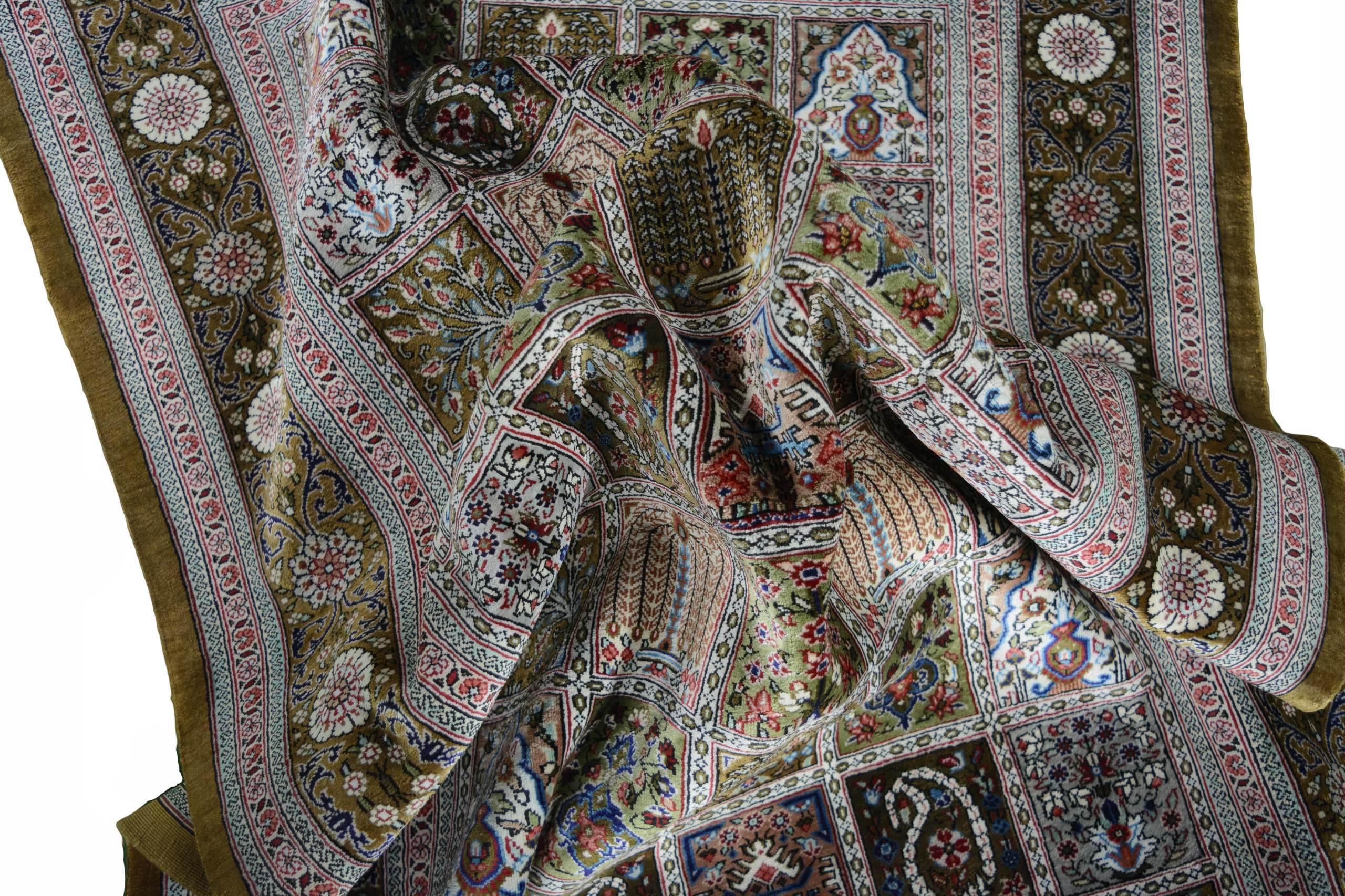 Flor aus Seide: Seide ist das feinste und geschmeidigste Garn der Welt und verleiht dem Teppich dadurch eine sehr exklusive Note. Seide wird nur für sehr hochwertige Teppiche verwendet und verleiht dem Teppich eine sehr angenehme Haptik.