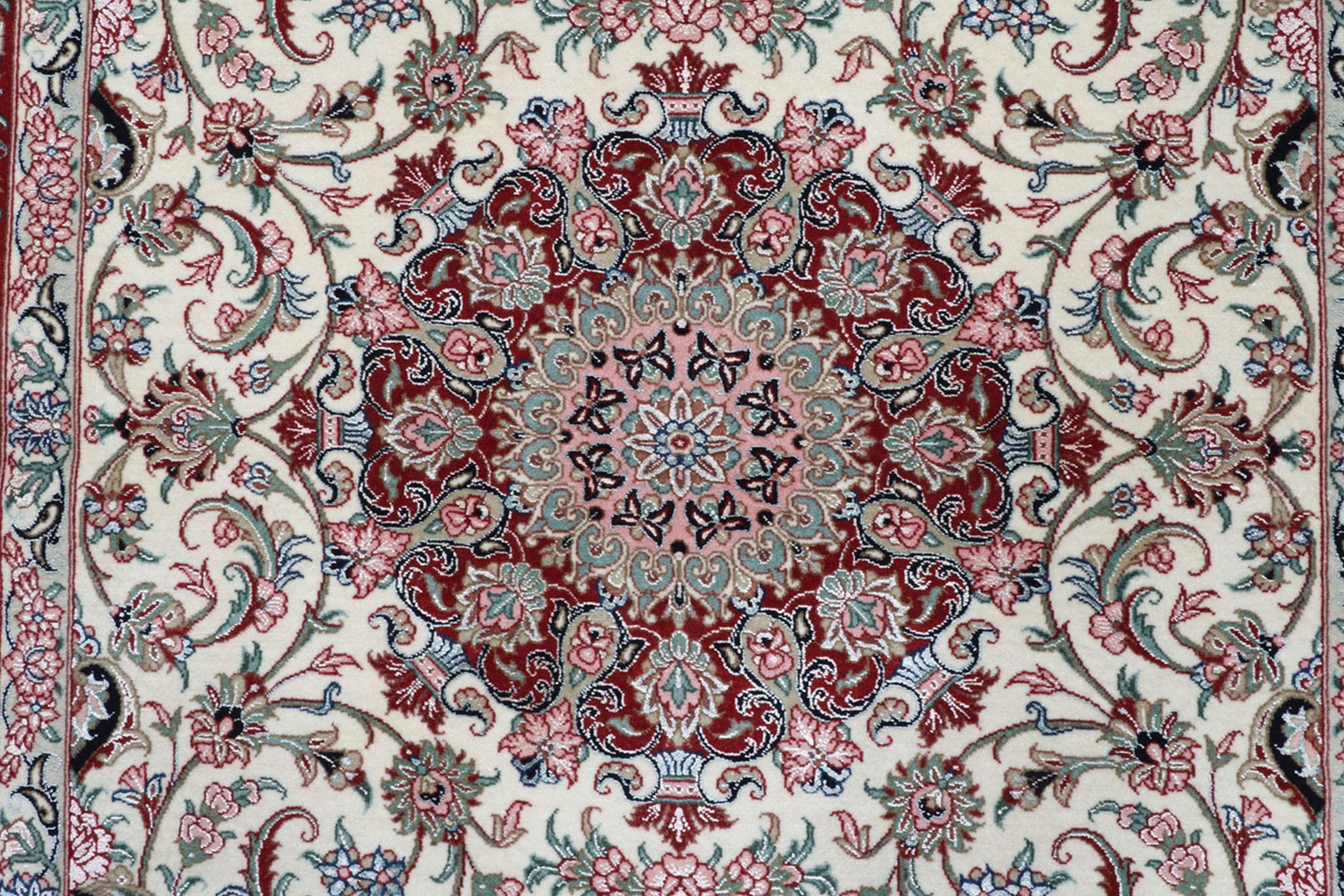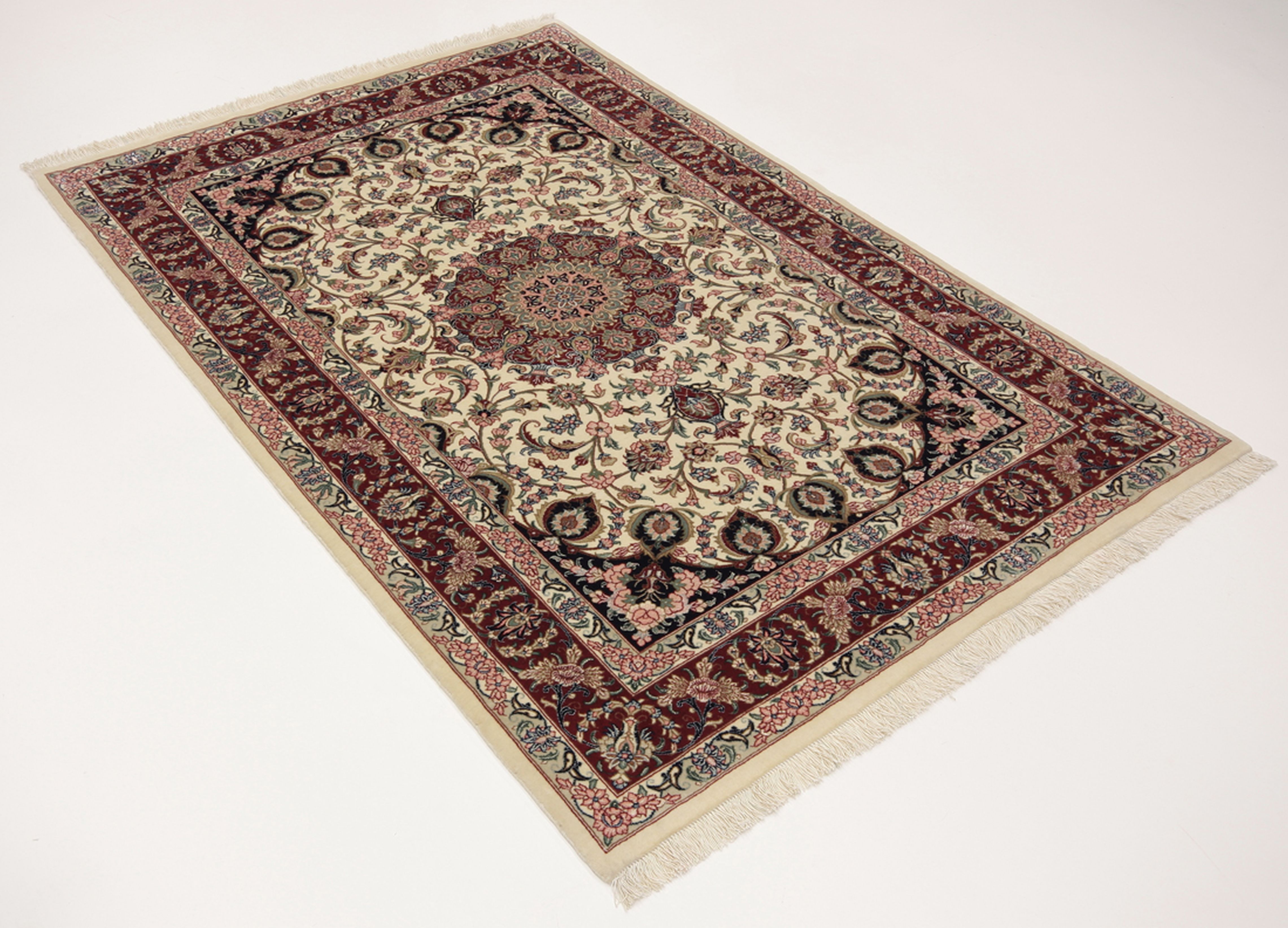Isfahan Teppiche: Die Stadt Isfahan ist das kulturelle Herz Persiens. Die Designs und Muster Isfahans beeinflussen bis heute den gesamten Orient. Feine Isfahan Teppiche erreichen eine Knotenzahl von bis zu einer Million Knoten pro Quadratmeter. Besonders feine und hochwertige Isfahan Teppiche werden auf Seide geknüpft. Mit einem echten Isfahan Teppich erhält Ihr Zuhause ein optisches Highlight persischer Knüpfkunst. Die hochwertige Verarbeitung, die feine Korkwolle und die floralen persischen Muster machen den Isfahan zum exklusivsten Perserteppich überhaupt.