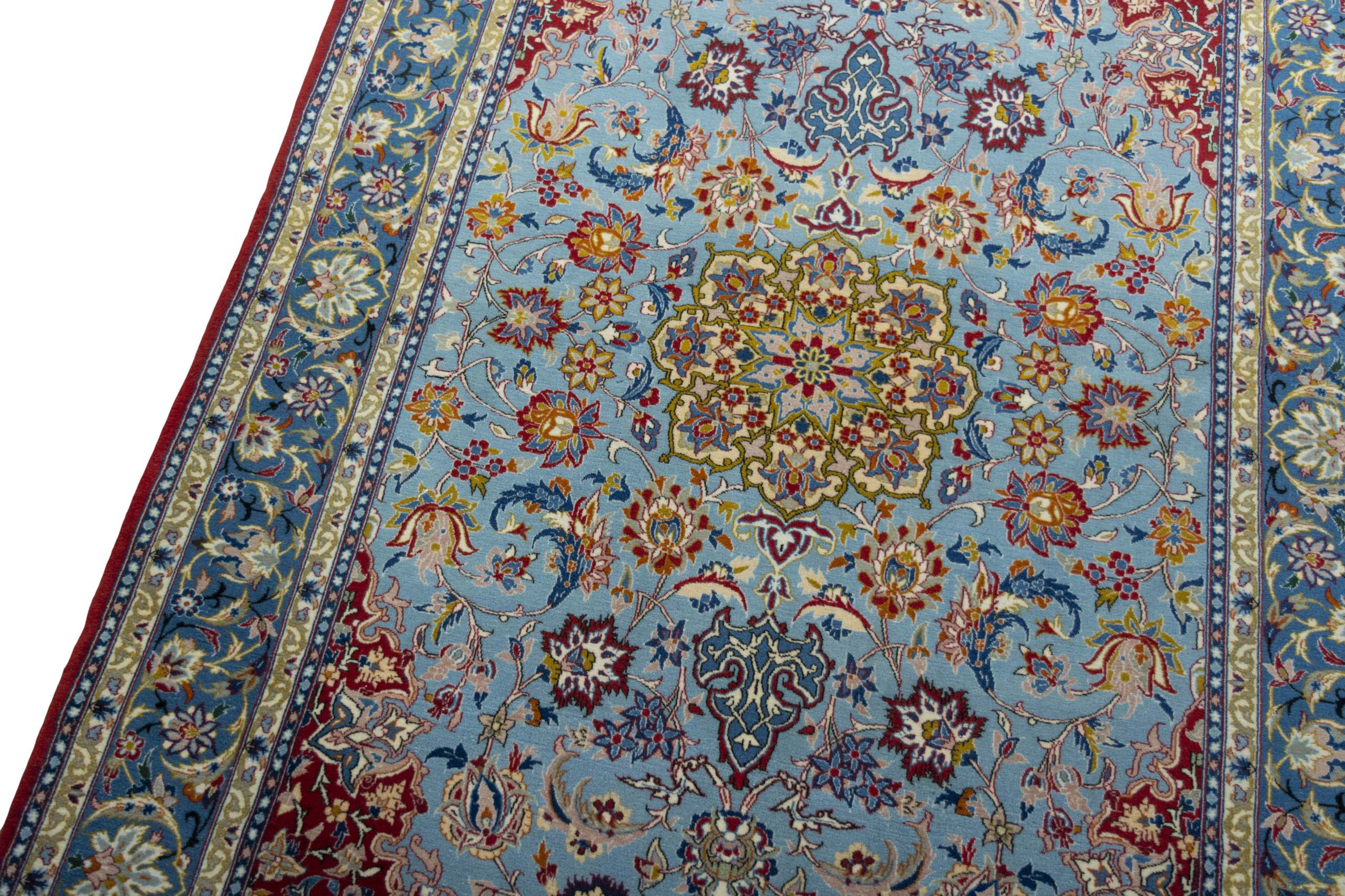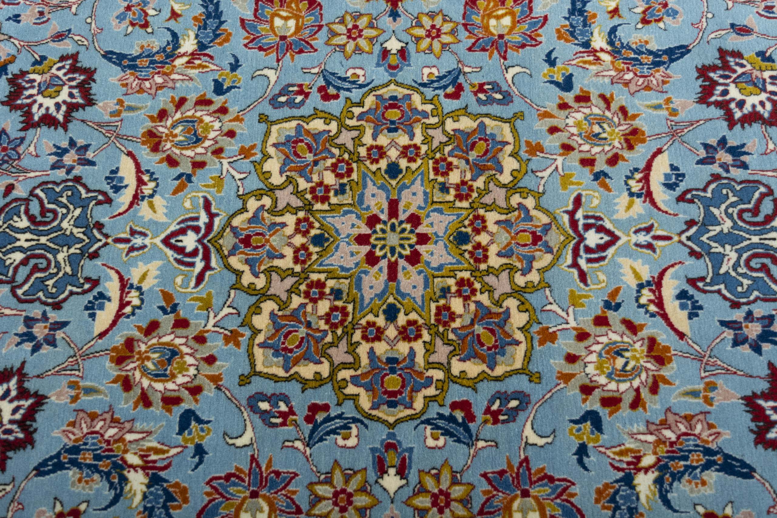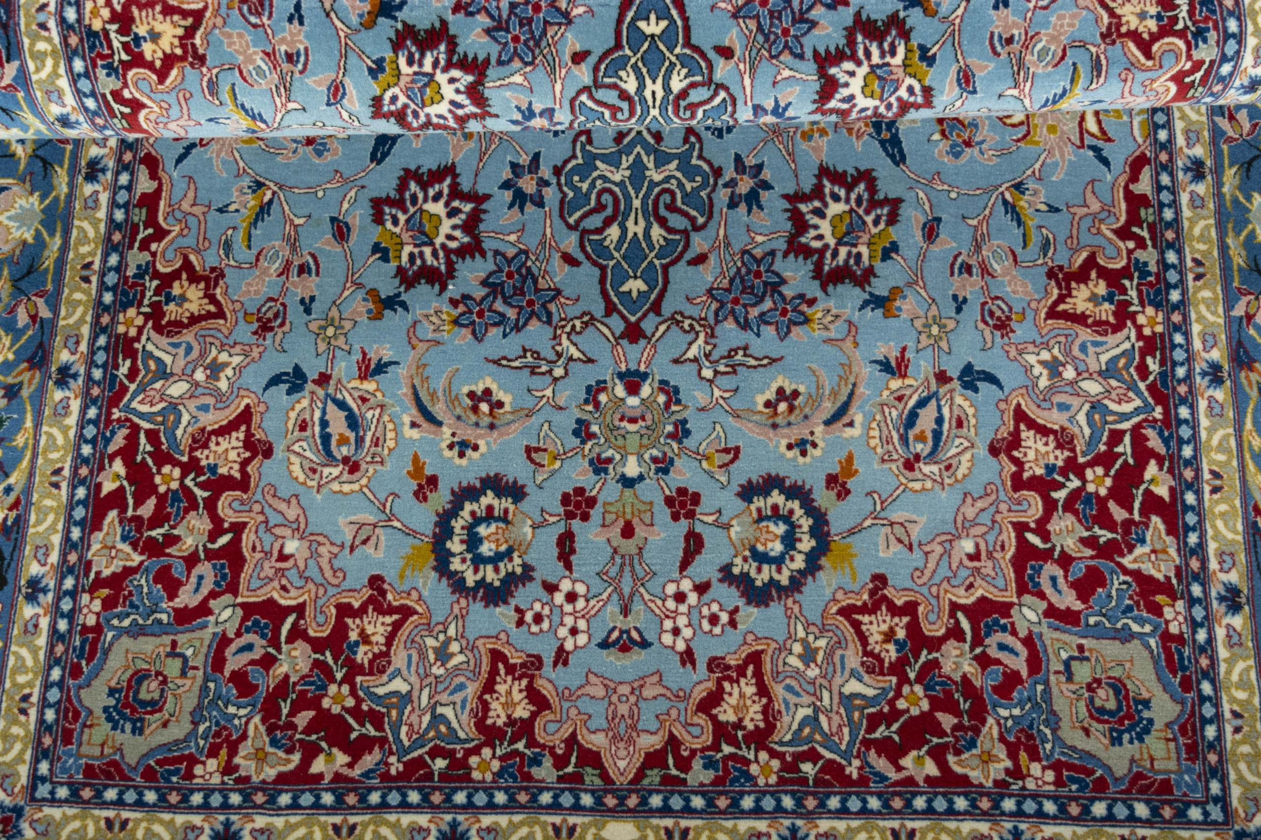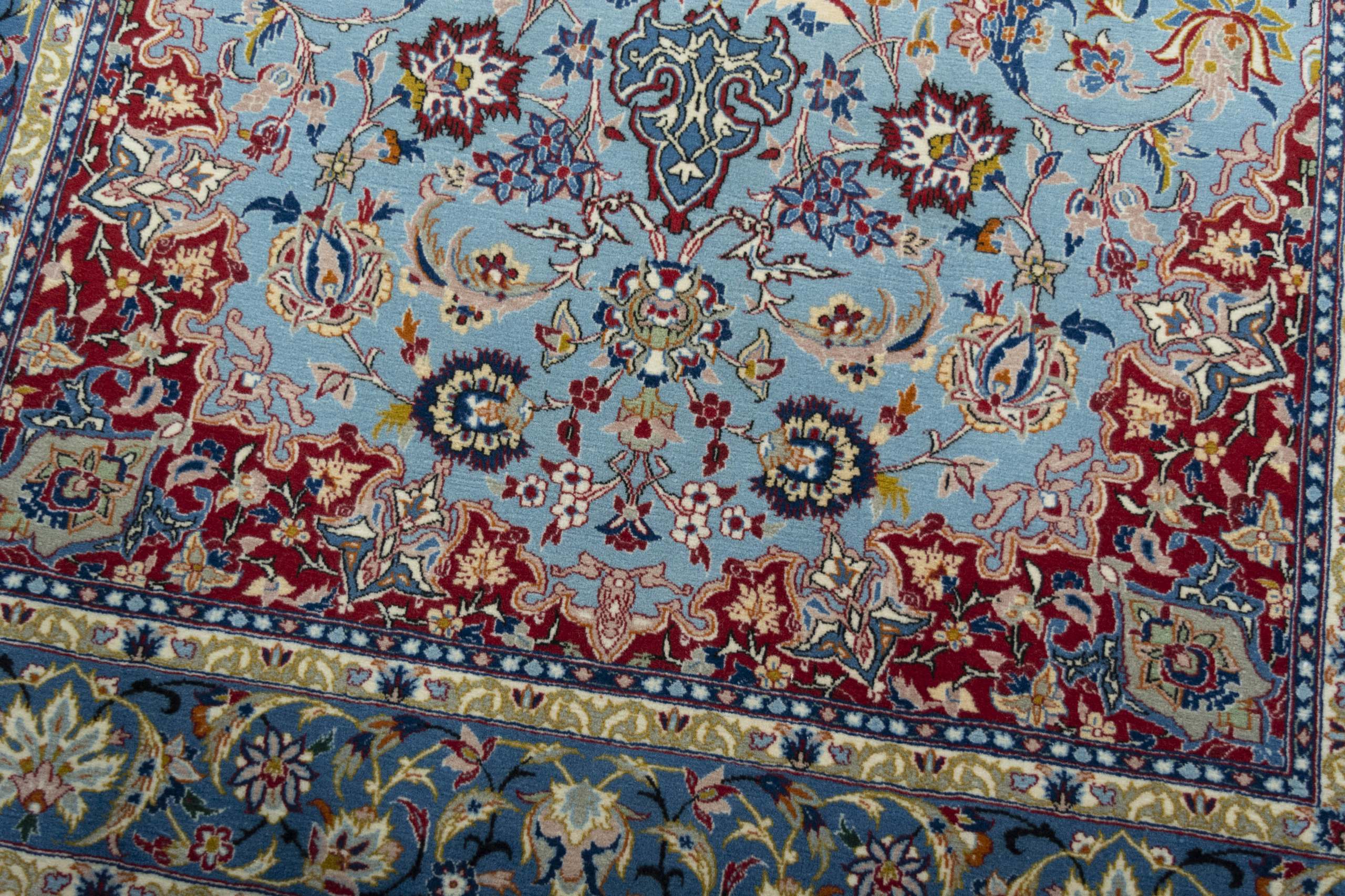 Isfahan Teppiche: Die Stadt Isfahan ist das kulturelle Herz Persiens. Die Designs und Muster Isfahans beeinflussen bis heute den gesamten Orient. Feine Isfahan Teppiche erreichen eine Knotenzahl von bis zu einer Million Knoten pro Quadratmeter. Besonders feine und hochwertige Isfahan Teppiche werden auf Seide geknüpft. Mit einem echten Isfahan Teppich erhält Ihr Zuhause ein optisches Highlight persischer Knüpfkunst. Die hochwertige Verarbeitung, die feine Korkwolle und die floralen persischen Muster machen den Isfahan zum exklusivsten Perserteppich überhaupt.