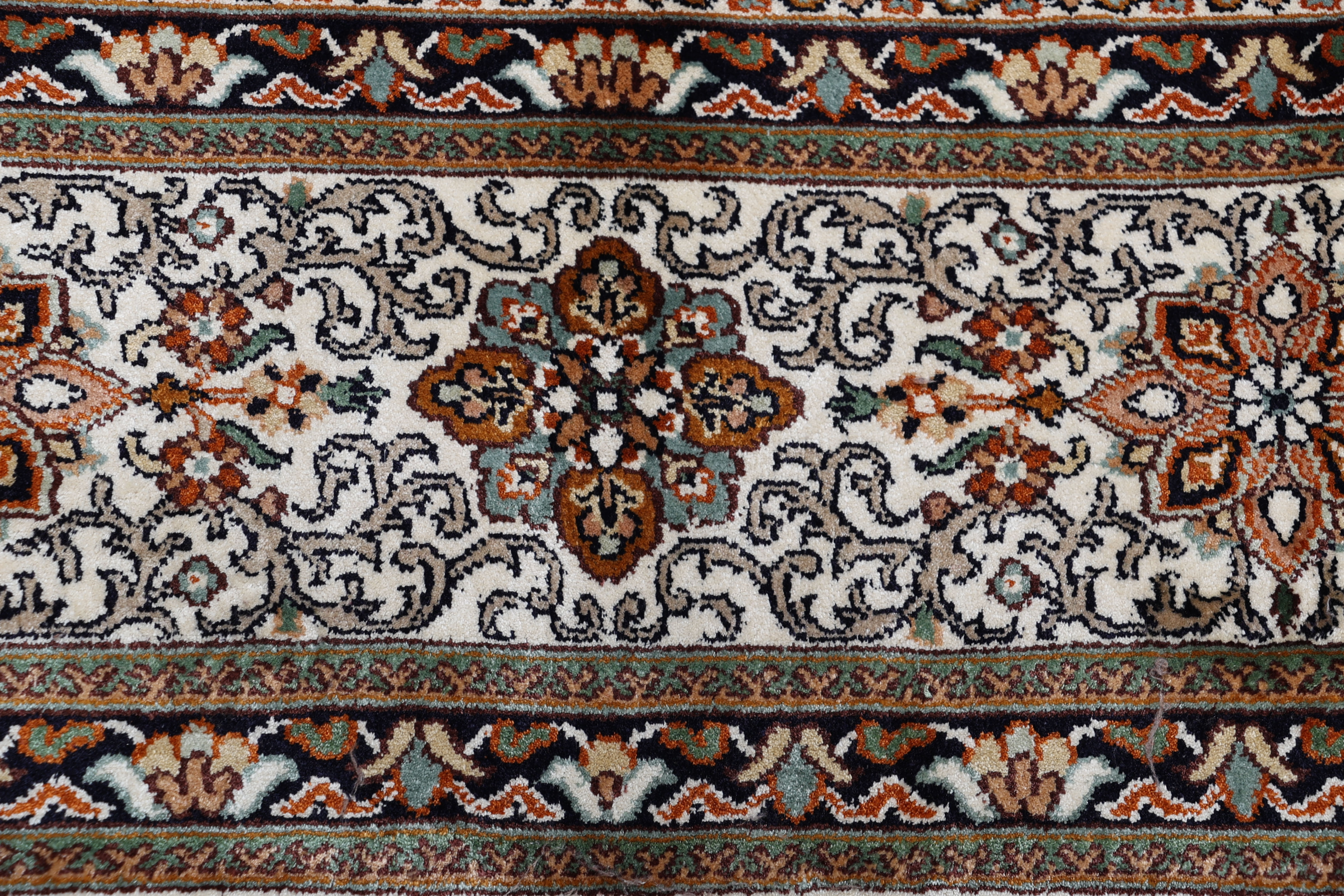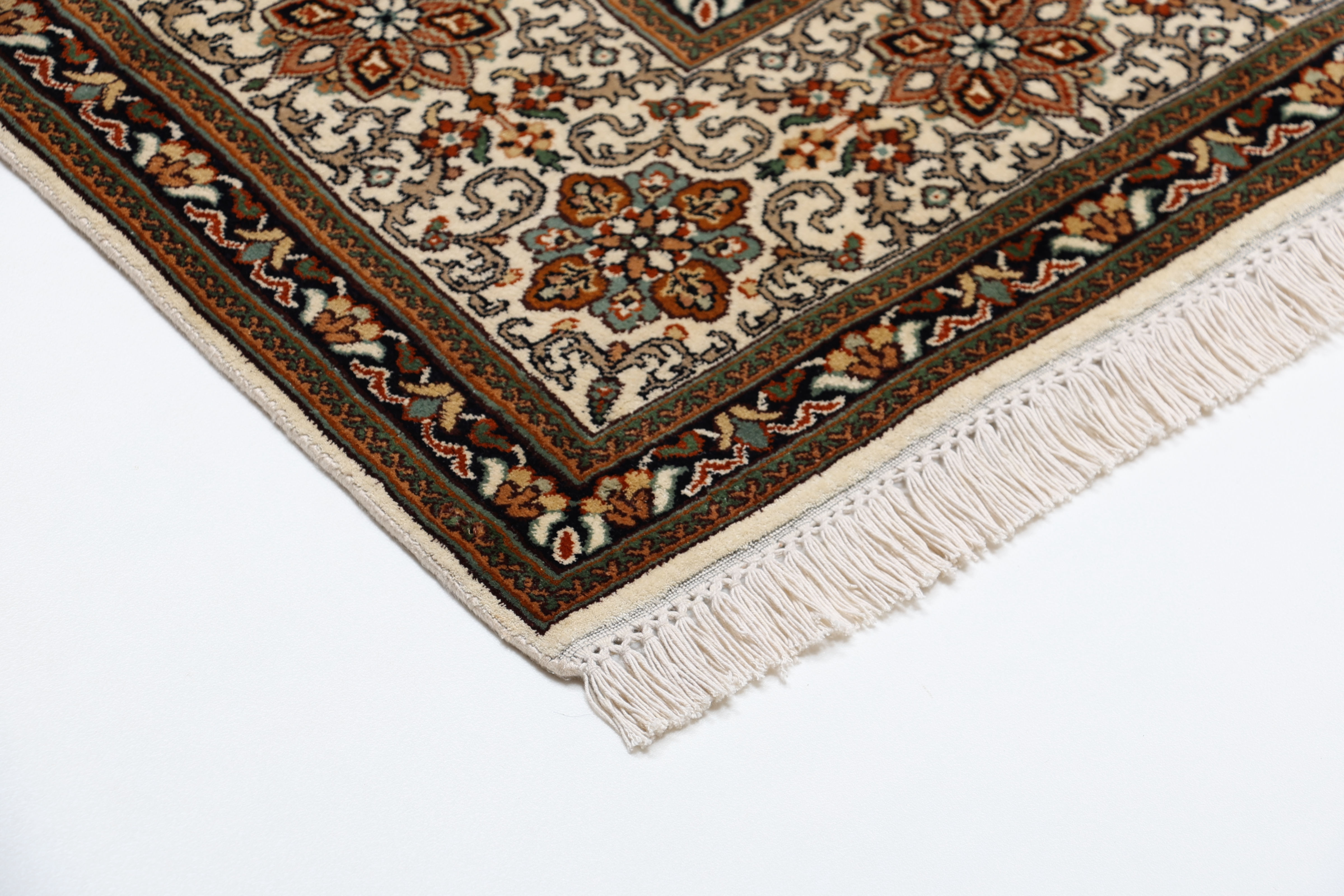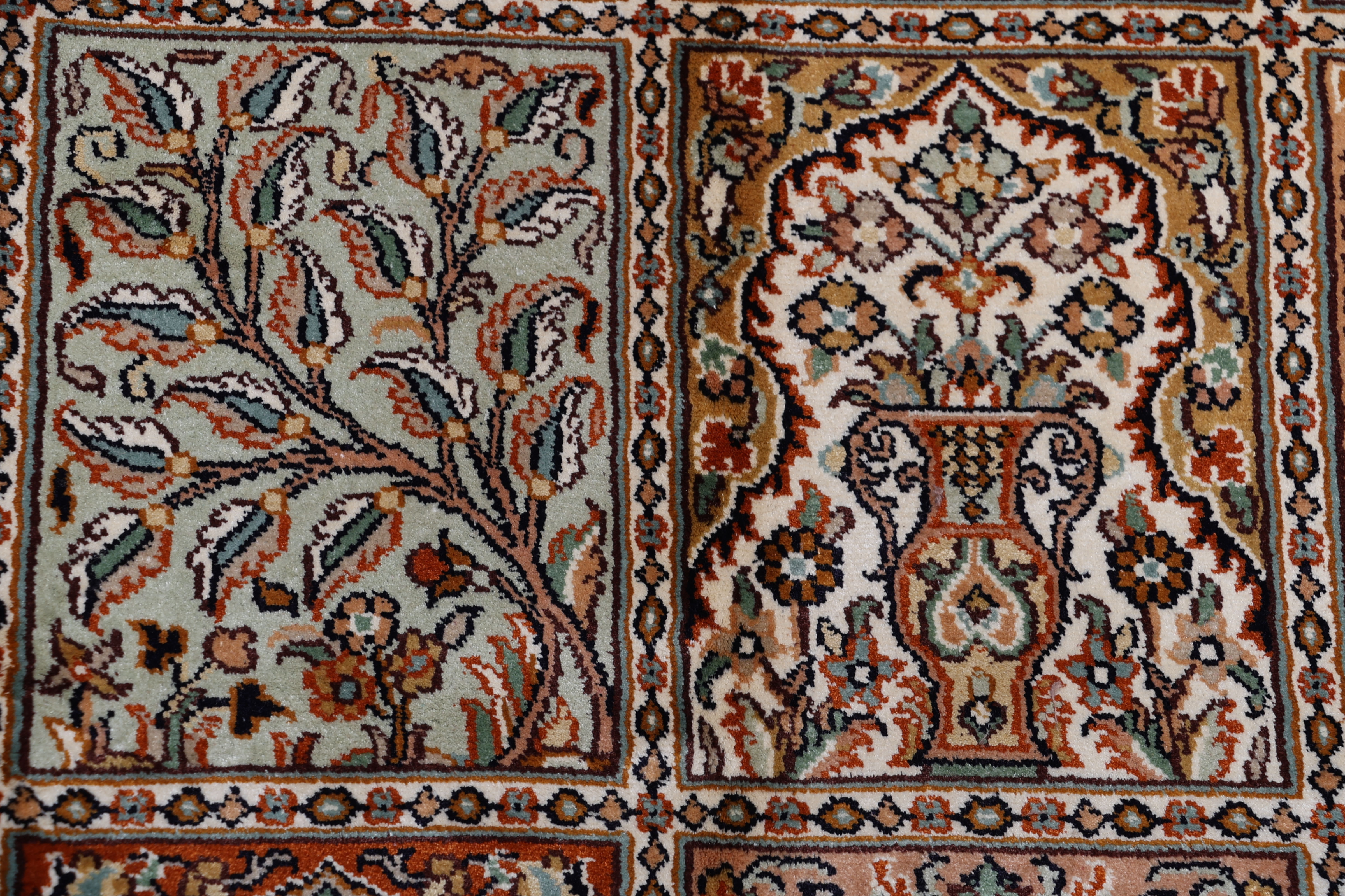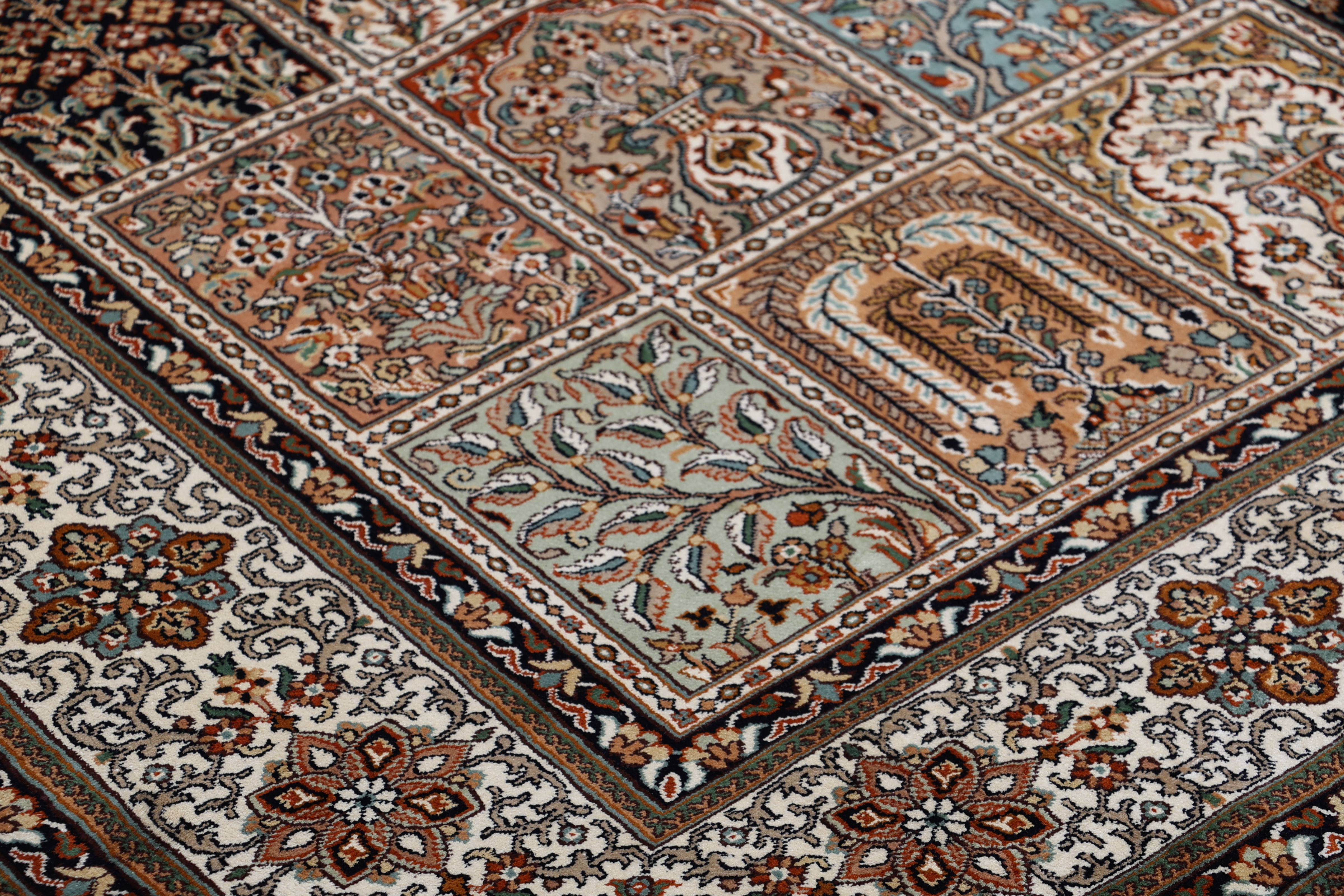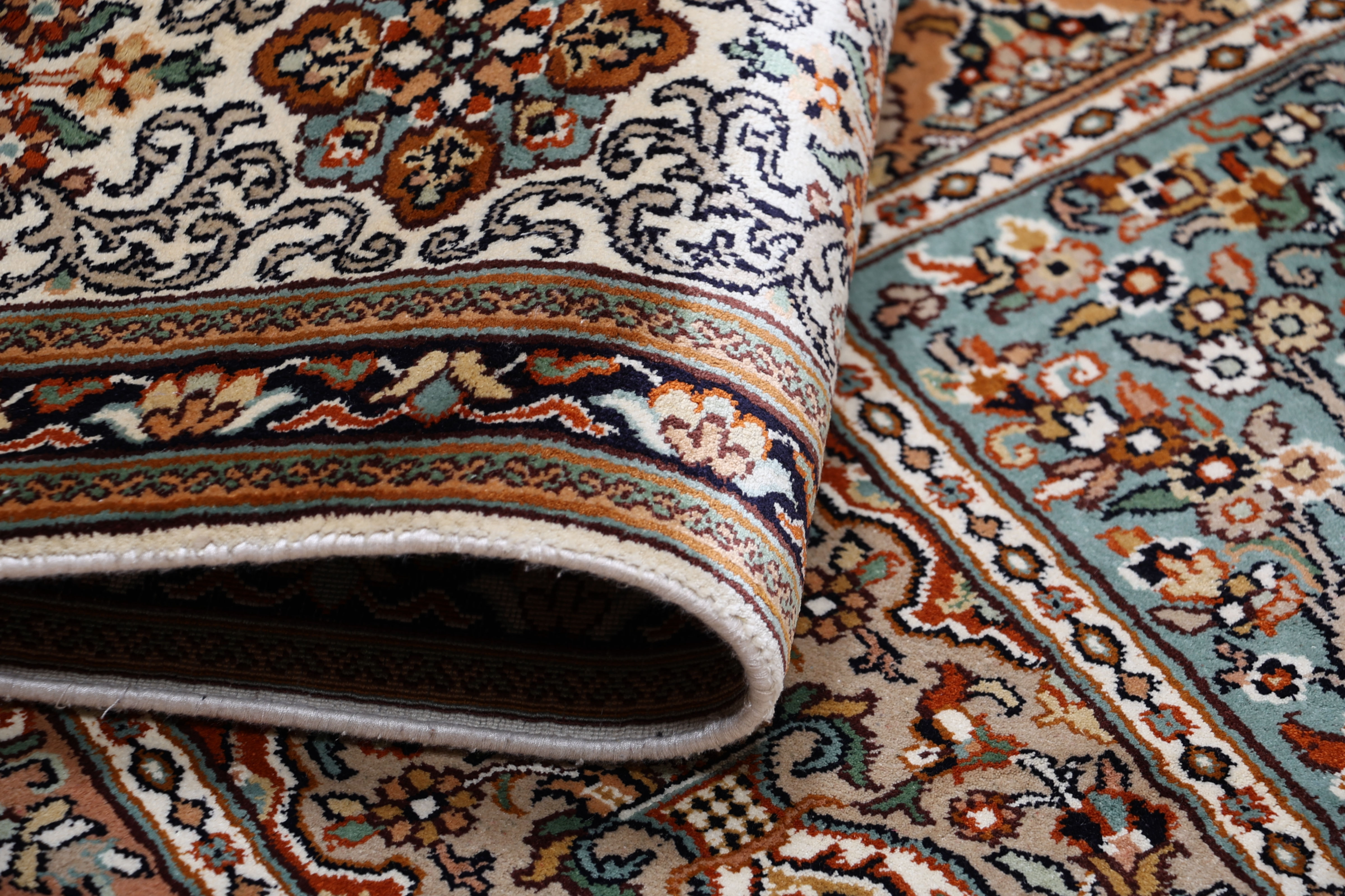 Flor aus Seide: Seide ist das feinste und geschmeidigste Garn der Welt und verleiht dem Teppich dadurch eine sehr exklusive Note. Seide wird nur für sehr hochwertige Teppiche verwendet und verleiht dem Teppich eine sehr angenehme Haptik.