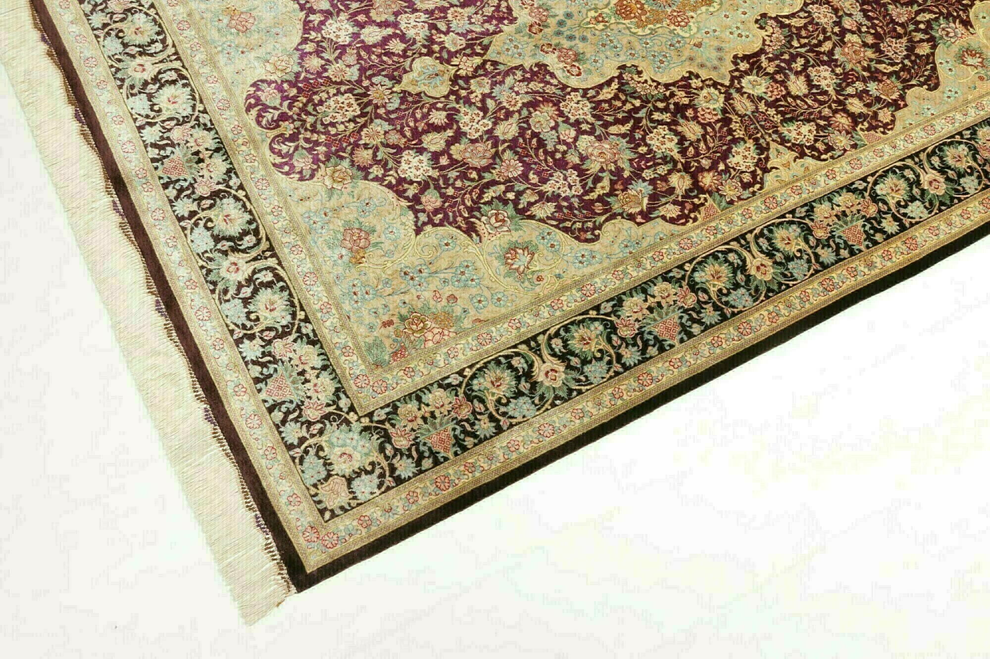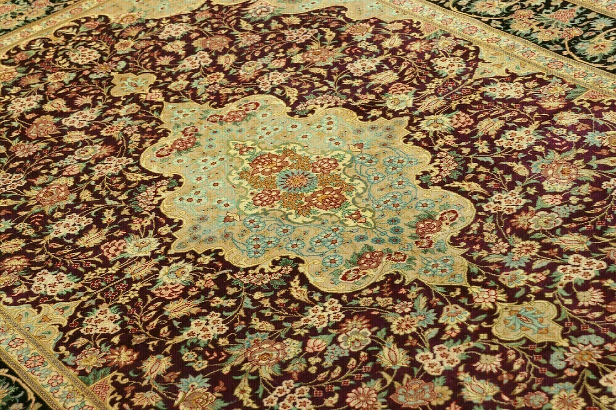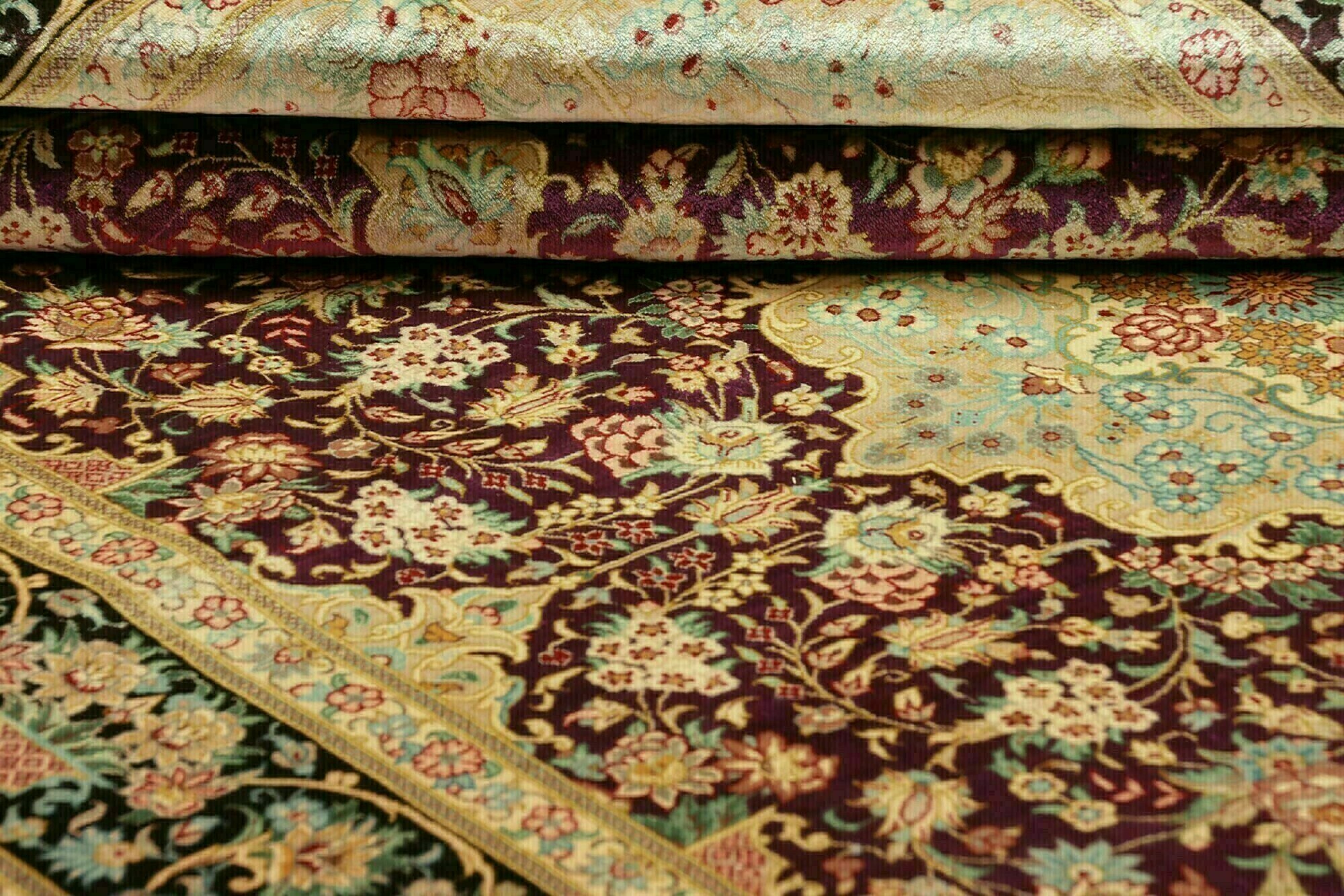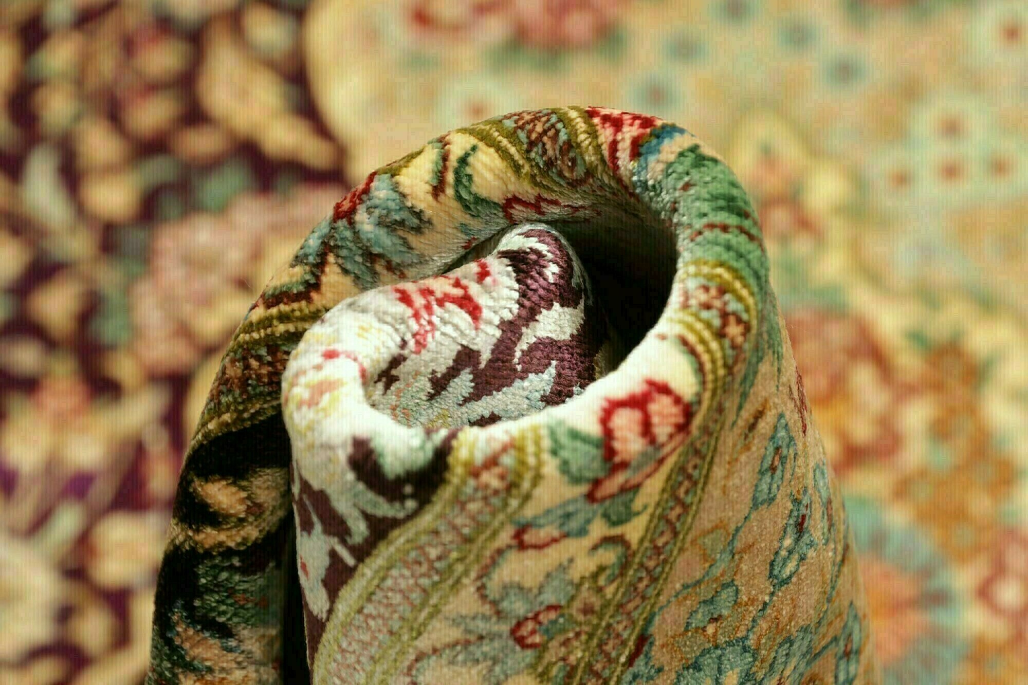 Flor aus Seide: Seide ist das feinste und geschmeidigste Garn der Welt und verleiht dem Teppich dadurch eine sehr exklusive Note. Seide wird nur für sehr hochwertige Teppiche verwendet und verleiht dem Teppich eine sehr angenehme Haptik.