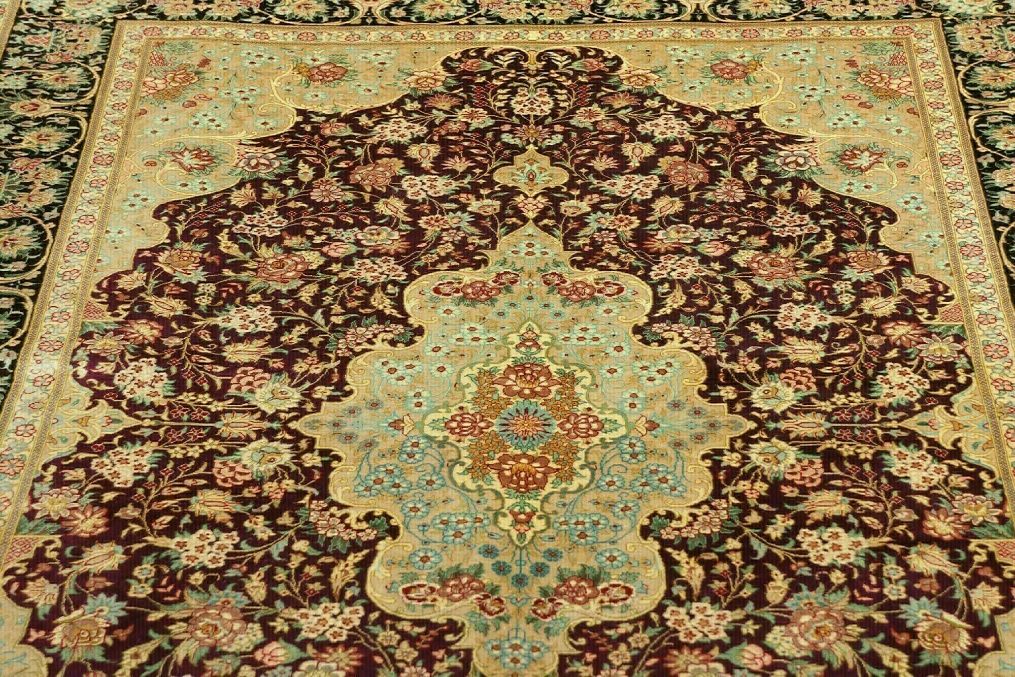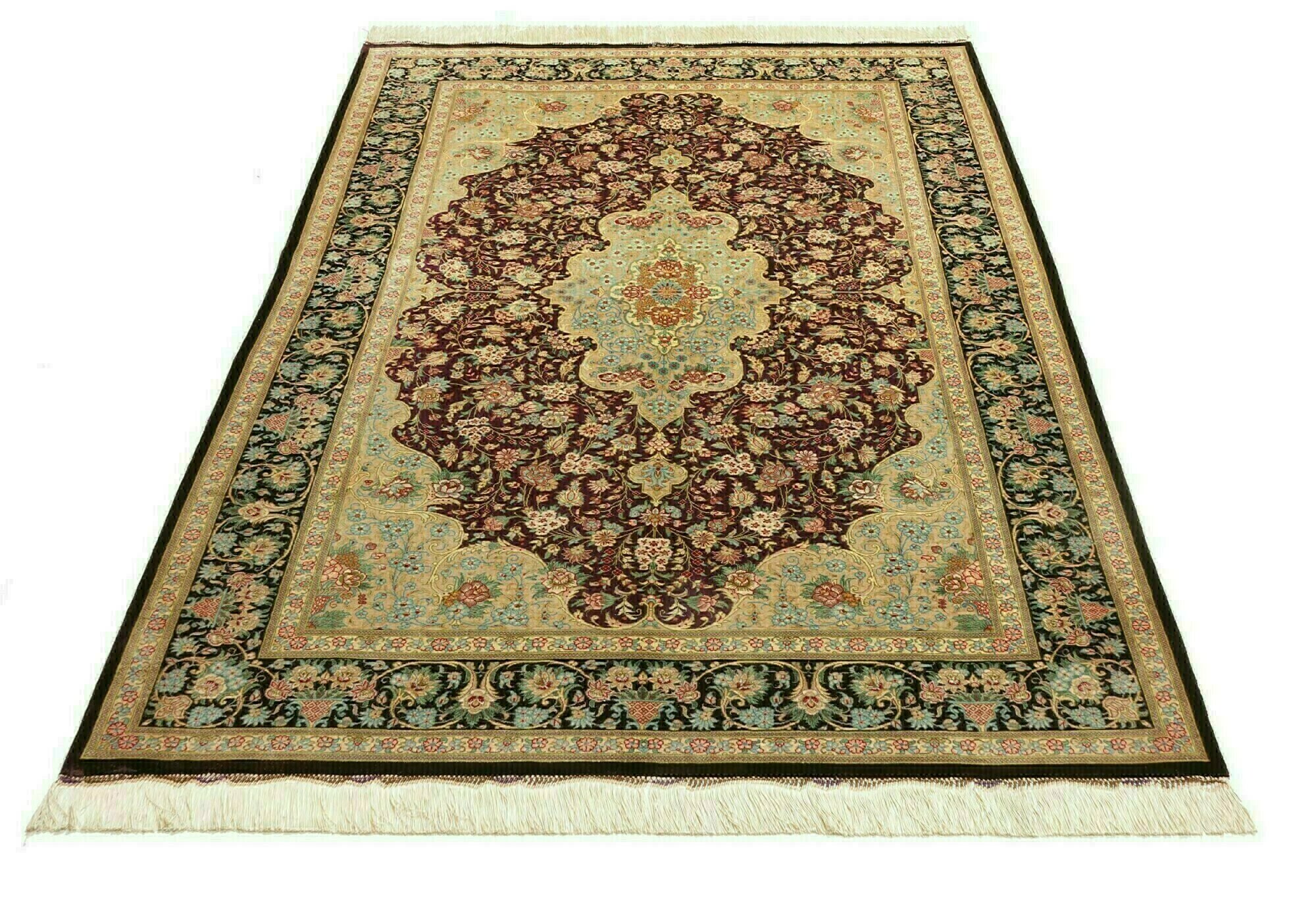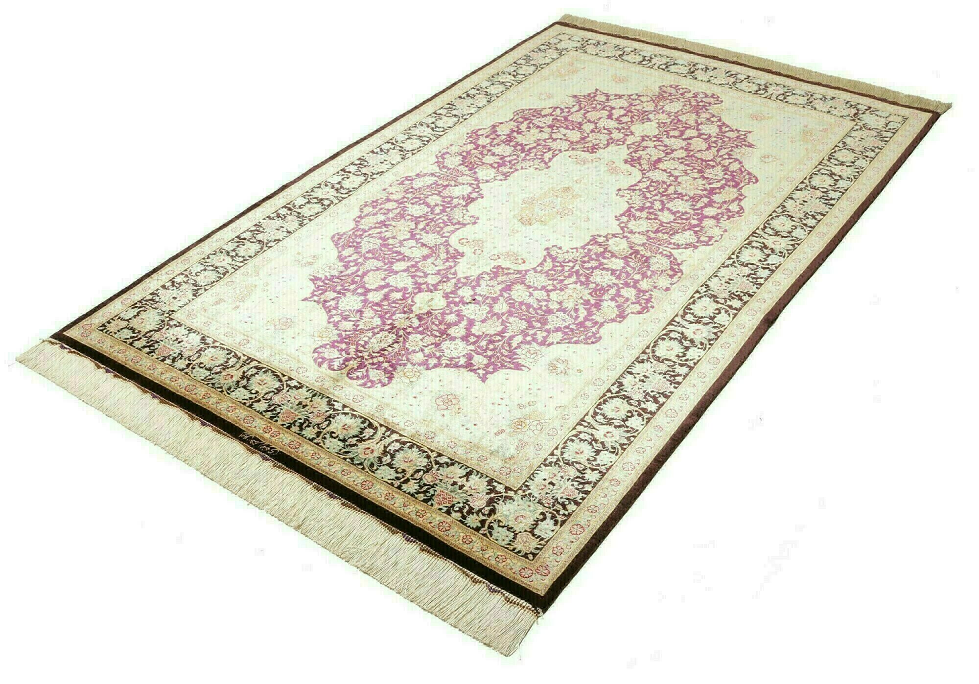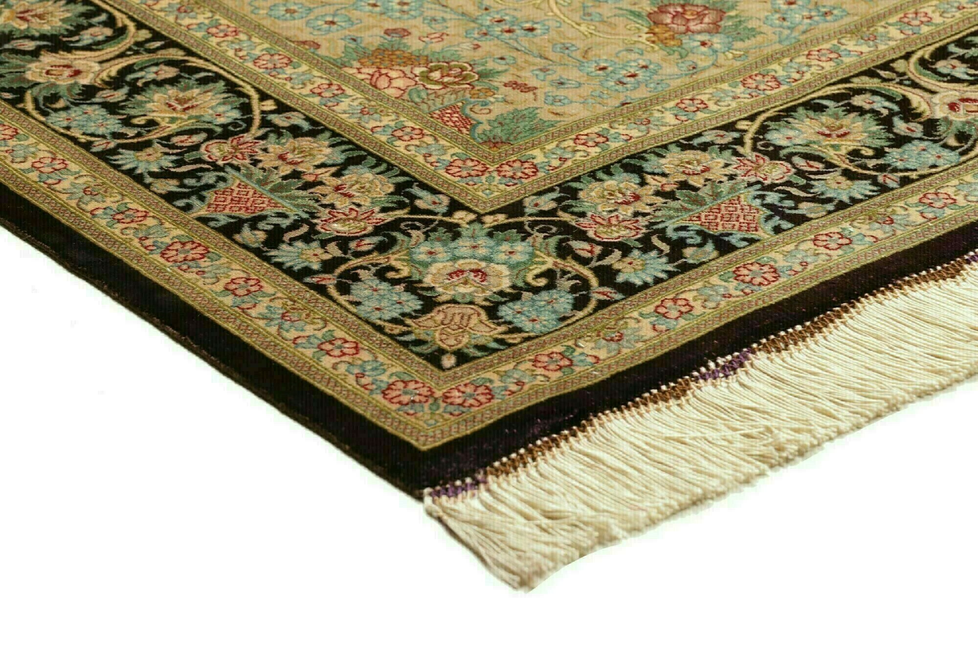 Flor aus Seide: Seide ist das feinste und geschmeidigste Garn der Welt und verleiht dem Teppich dadurch eine sehr exklusive Note. Seide wird nur für sehr hochwertige Teppiche verwendet und verleiht dem Teppich eine sehr angenehme Haptik.