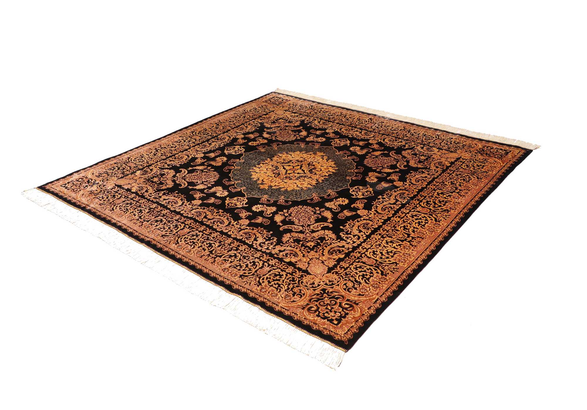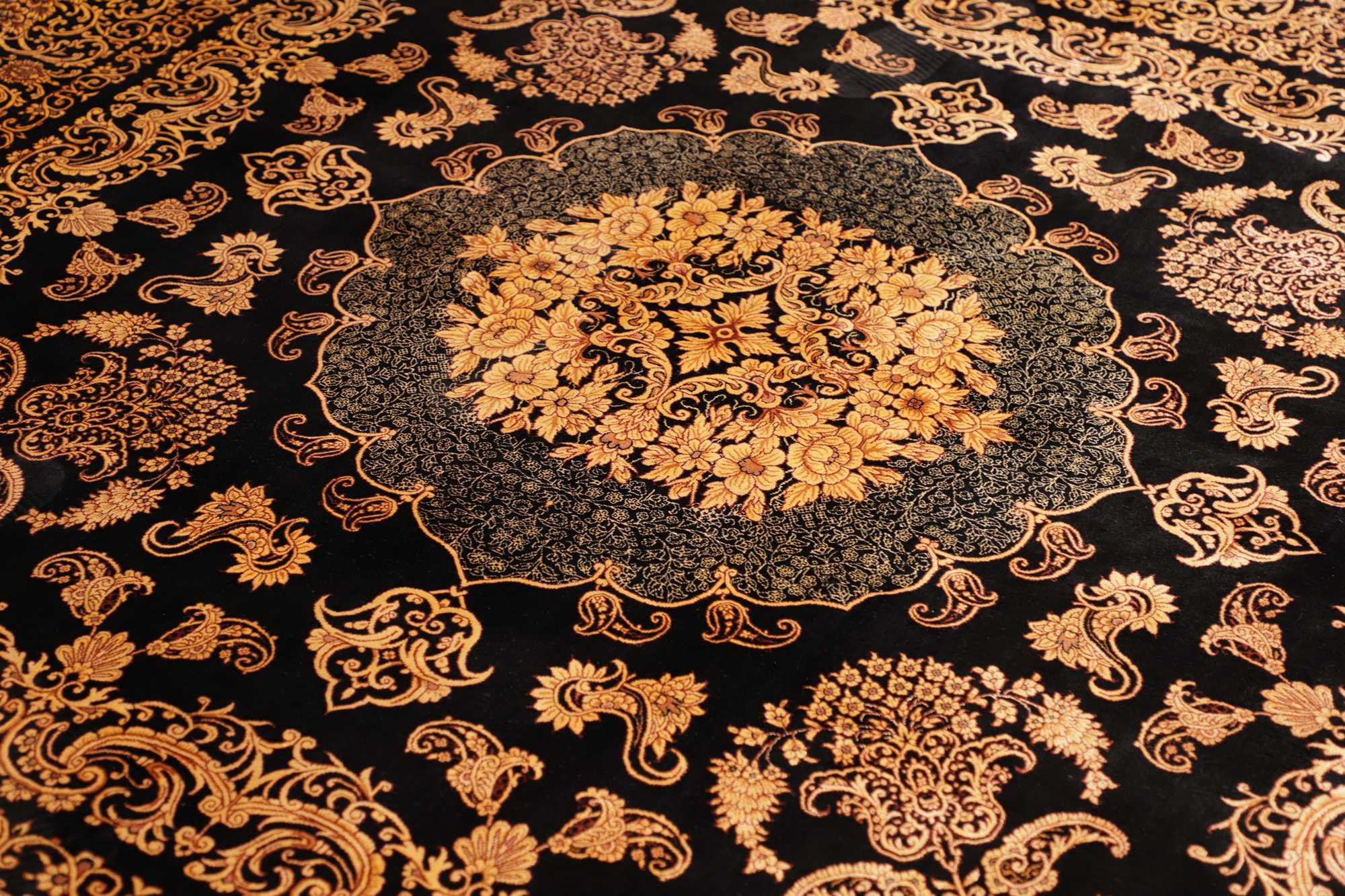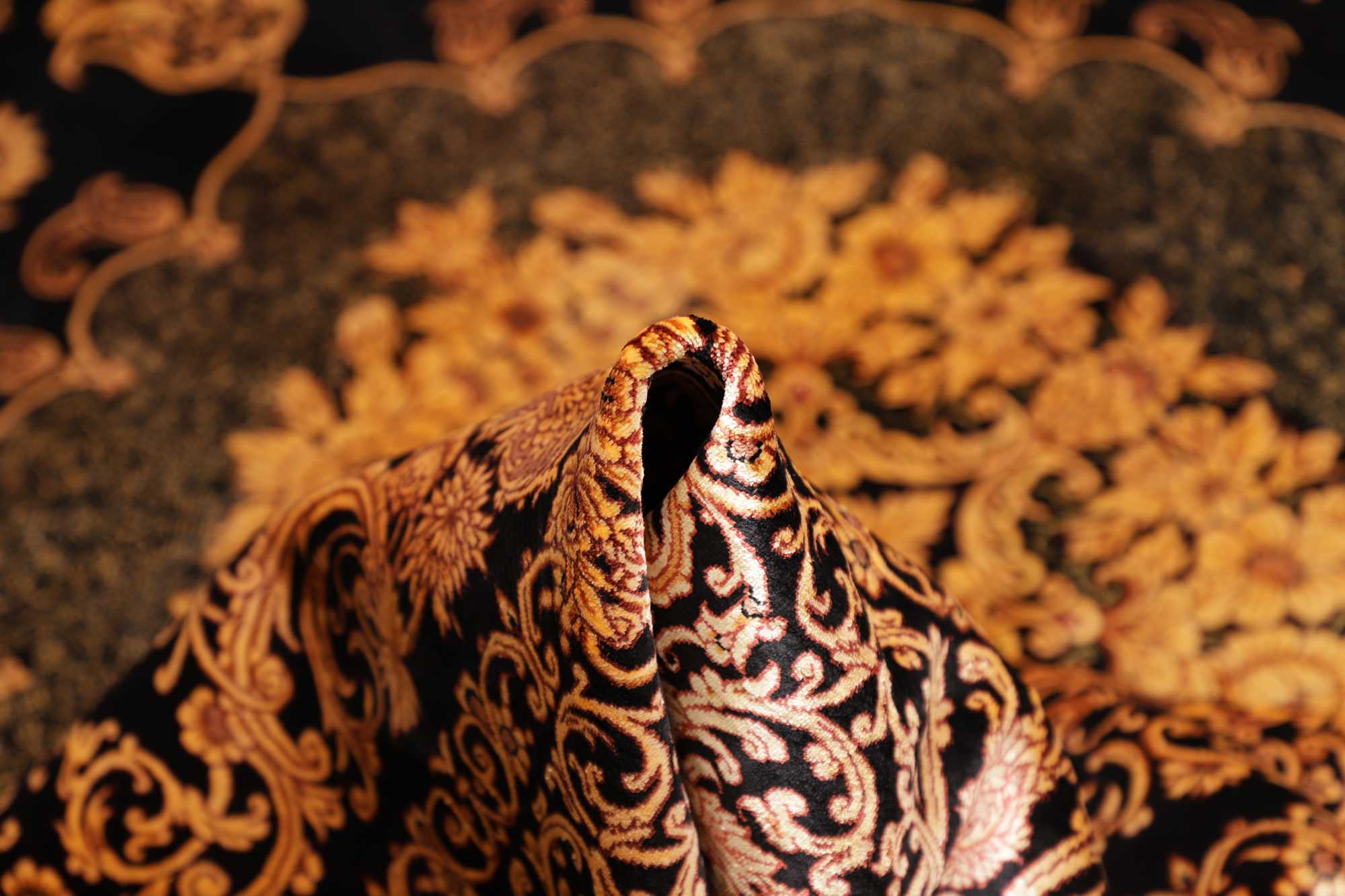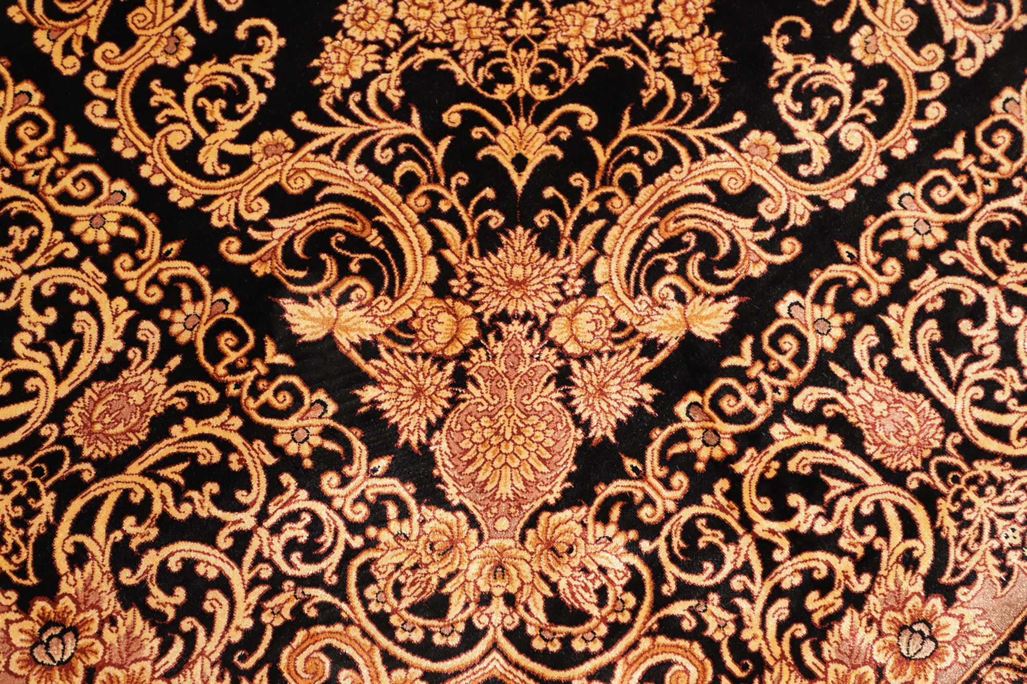 Flor aus Seide: Seide ist das feinste und geschmeidigste Garn der Welt und verleiht dem Teppich dadurch eine sehr exklusive Note. Seide wird nur für sehr hochwertige Teppiche verwendet und verleiht dem Teppich eine sehr angenehme Haptik.