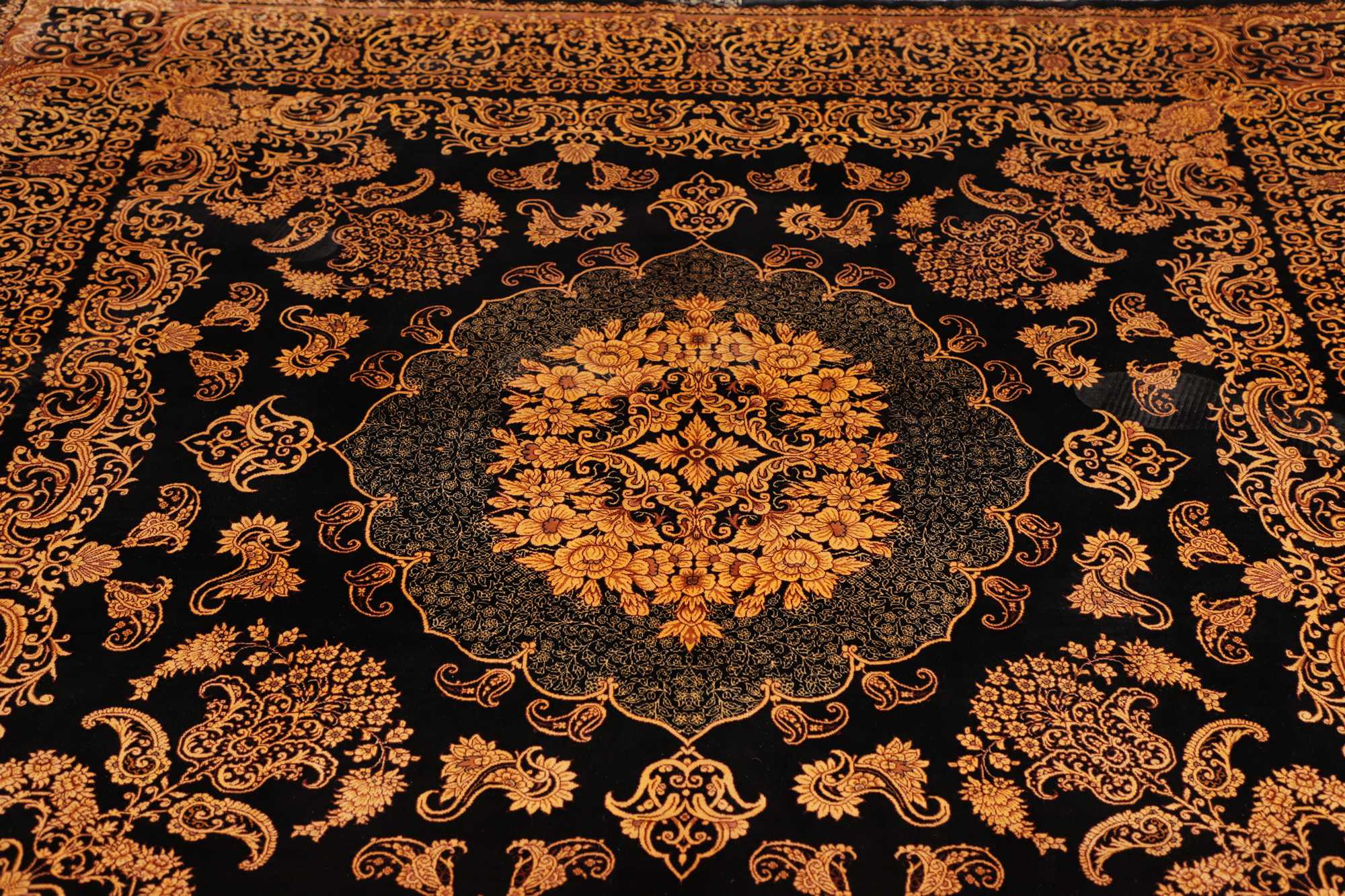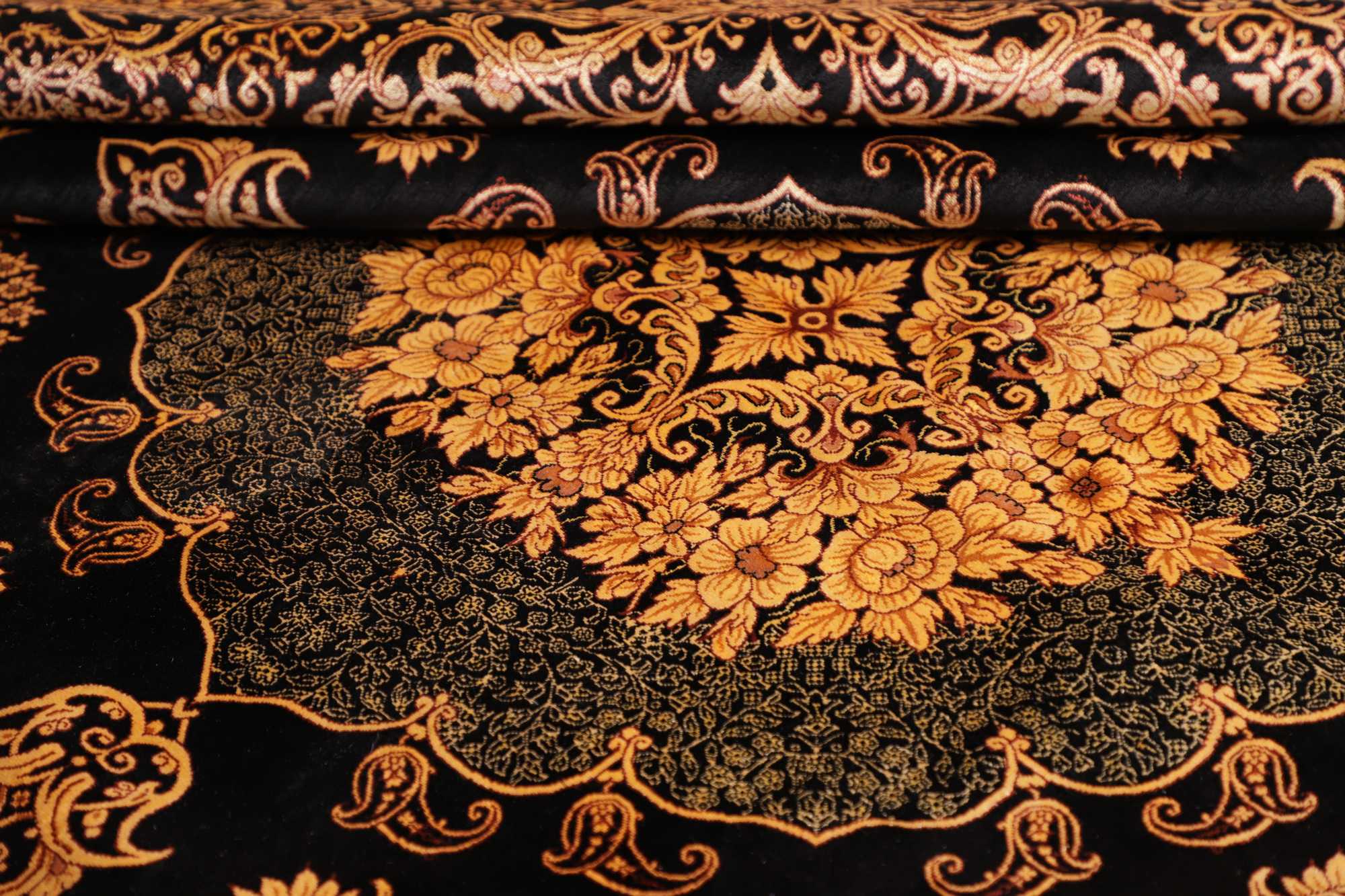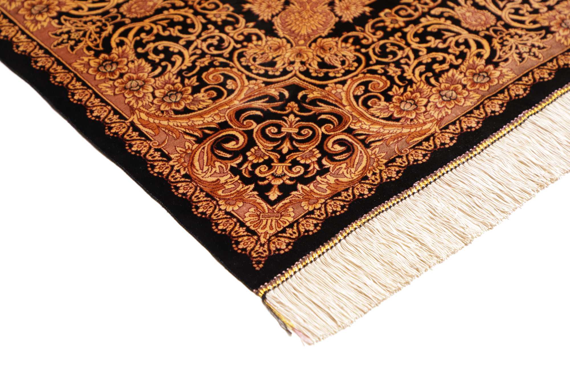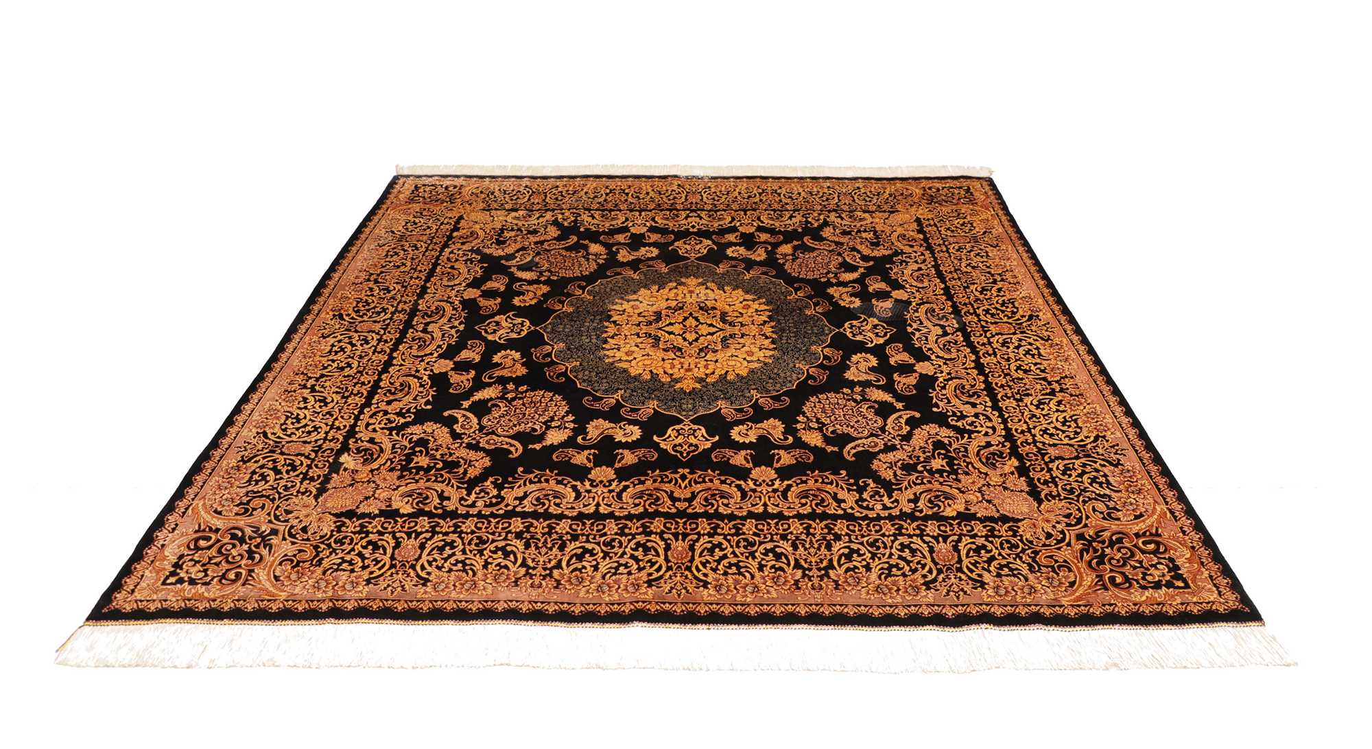 Flor aus Seide: Seide ist das feinste und geschmeidigste Garn der Welt und verleiht dem Teppich dadurch eine sehr exklusive Note. Seide wird nur für sehr hochwertige Teppiche verwendet und verleiht dem Teppich eine sehr angenehme Haptik.