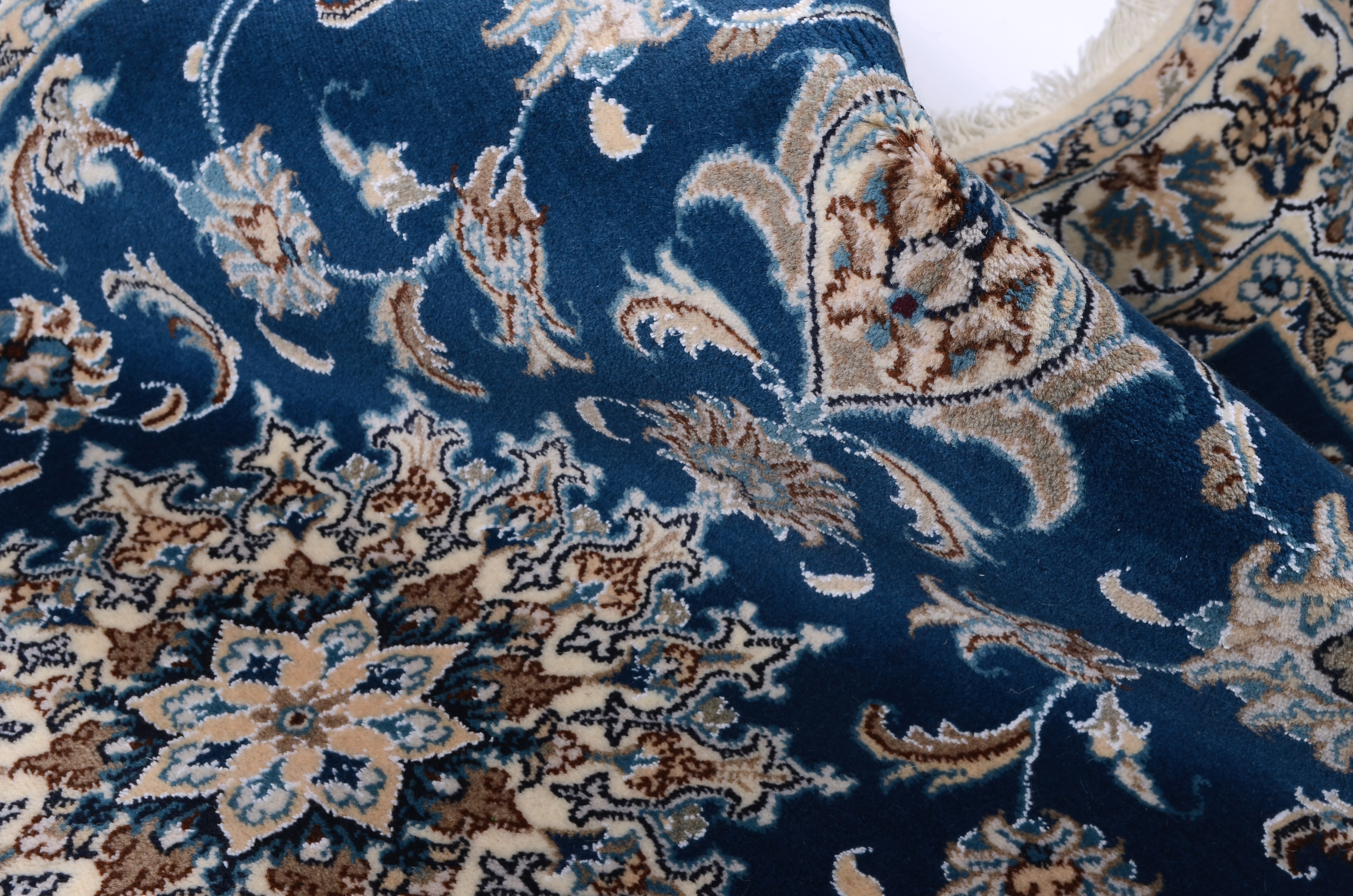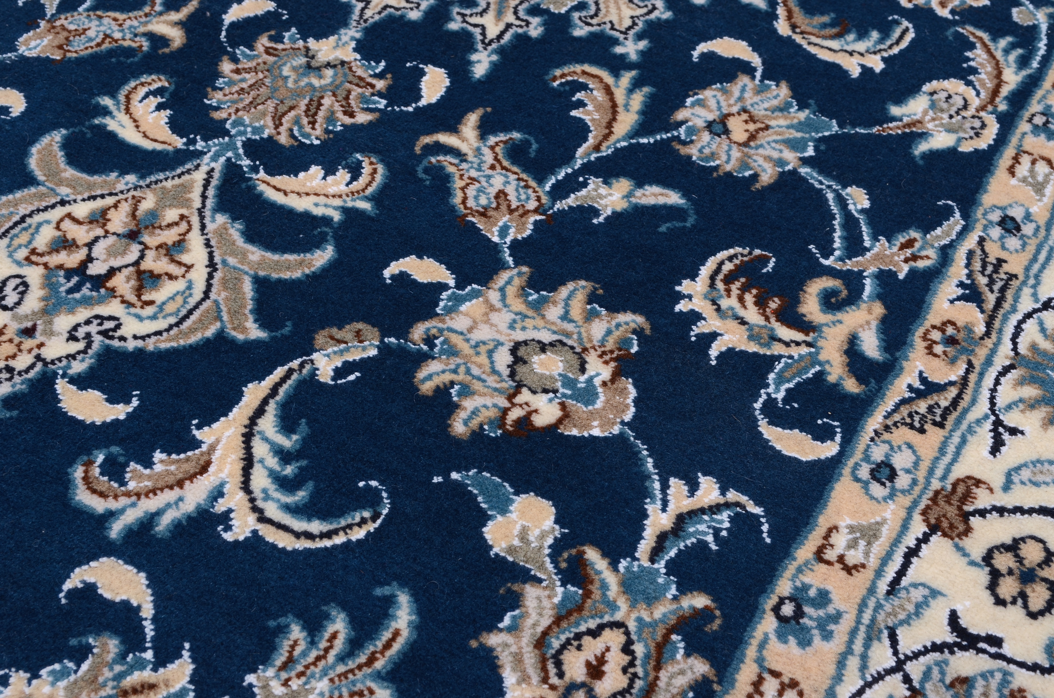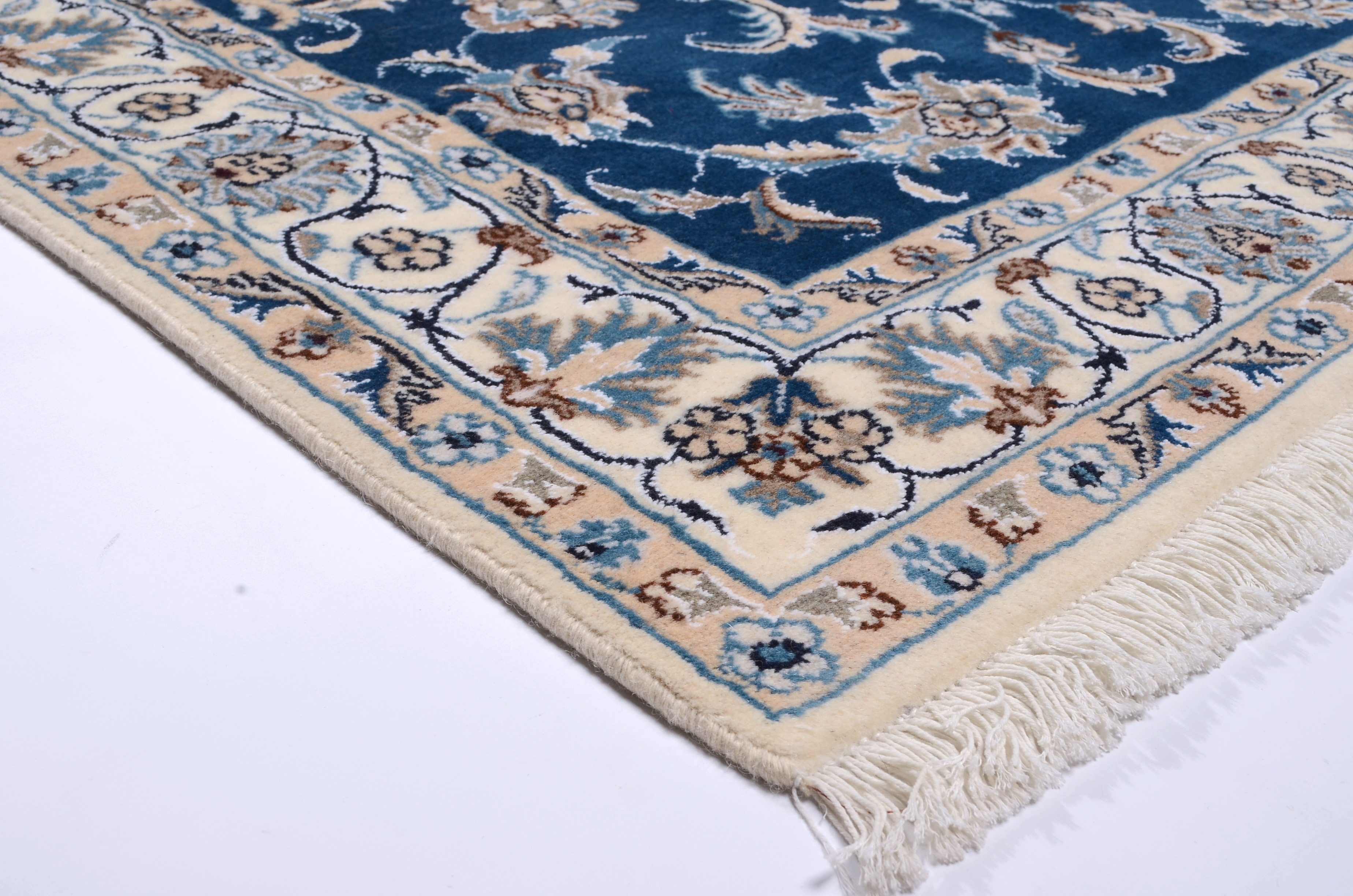 Nain Teppiche: Nain Teppiche entstammen der persischen Oasenstadt in der Provinz Isfahan. Die Stadt Nain ist weltweit bekannt für ihre Teppichknüpfereien und auch vielen Laien ein Begriff. Der unverwechselbare helle Grundton wird meistens mit einem kräftigen, königsblauen Ton kombiniert. Die Musterung der Teppiche reicht von klassischen floralen Motiven bis hin zu sehr ungewöhnlichen Neuinterpretationen andere persischer Muster. Durch seine Musterung, Farbwahl und Knüpfung ist der Nain Teppich ein besonders exklusiver Perserteppich, der Ihrer Einrichtung eine exklusive Note und einen echten Blickfang verleiht.