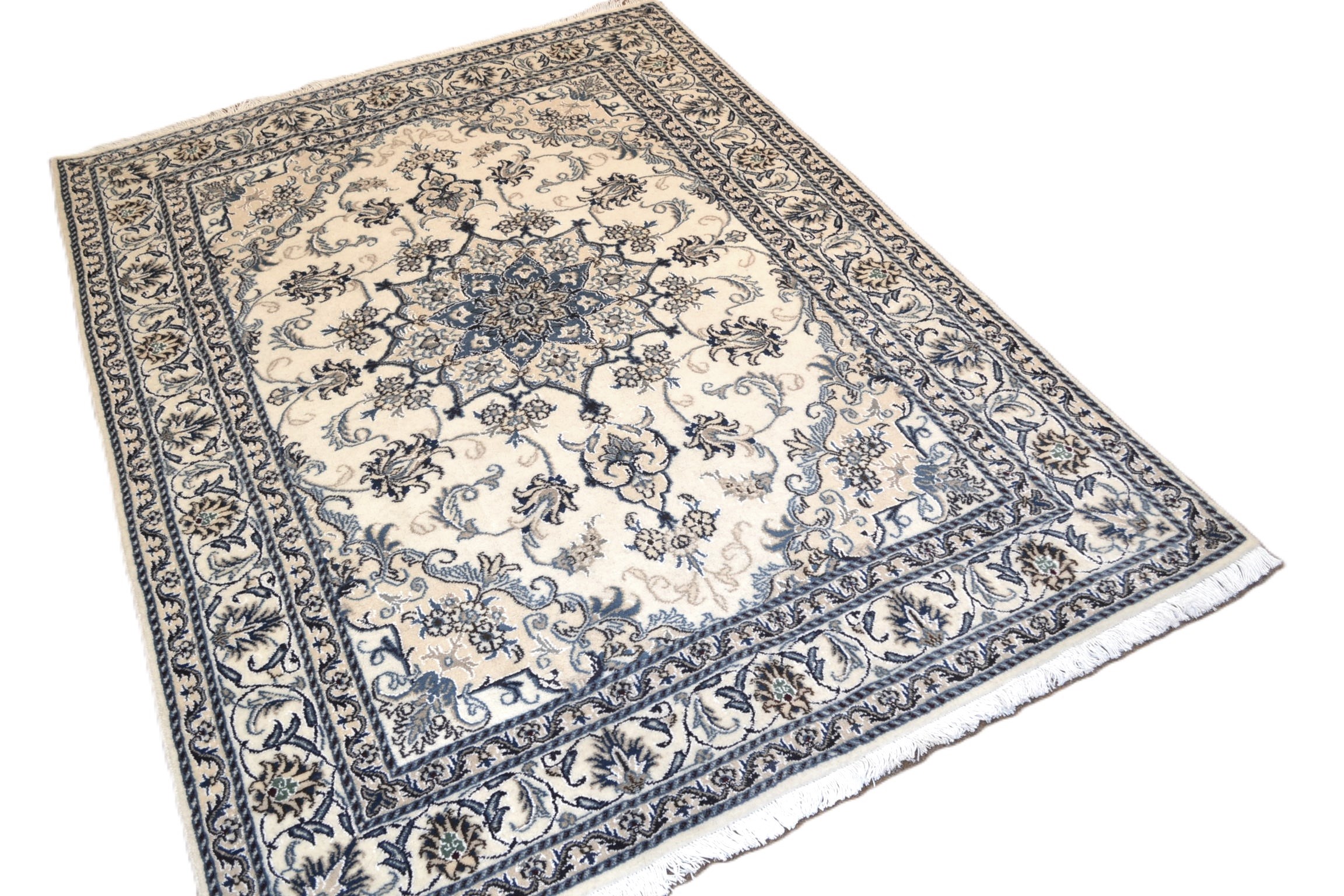Nain Teppiche: Nain Teppiche entstammen der persischen Oasenstadt in der Provinz Isfahan. Die Stadt Nain ist weltweit bekannt für ihre Teppichknüpfereien und auch vielen Laien ein Begriff. Der unverwechselbare helle Grundton wird meistens mit einem kräftigen, königsblauen Ton kombiniert. Die Musterung der Teppiche reicht von klassischen floralen Motiven bis hin zu sehr ungewöhnlichen Neuinterpretationen andere persischer Muster. Durch seine Musterung, Farbwahl und Knüpfung ist der Nain Teppich ein besonders exklusiver Perserteppich, der Ihrer Einrichtung eine exklusive Note und einen echten Blickfang verleiht.