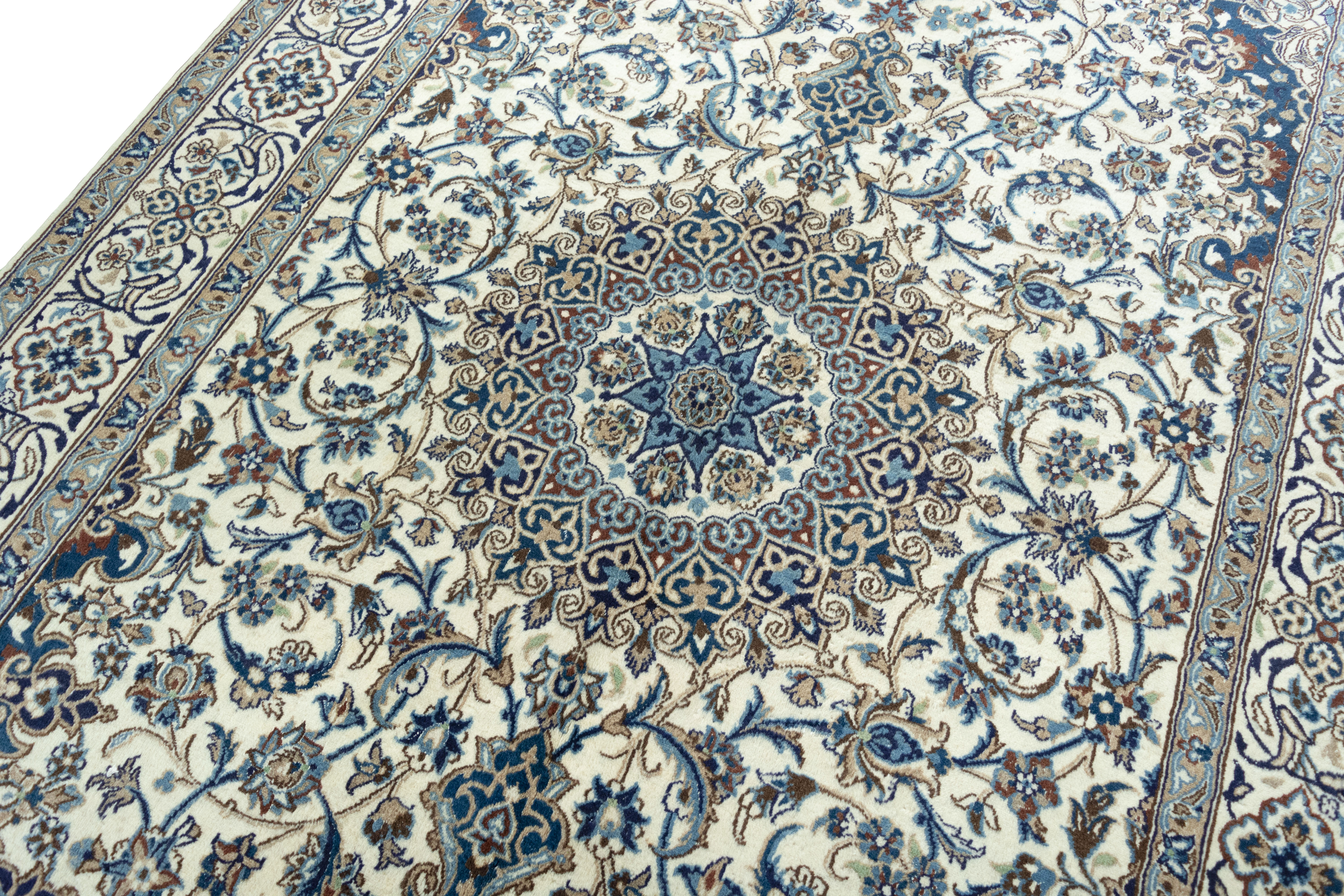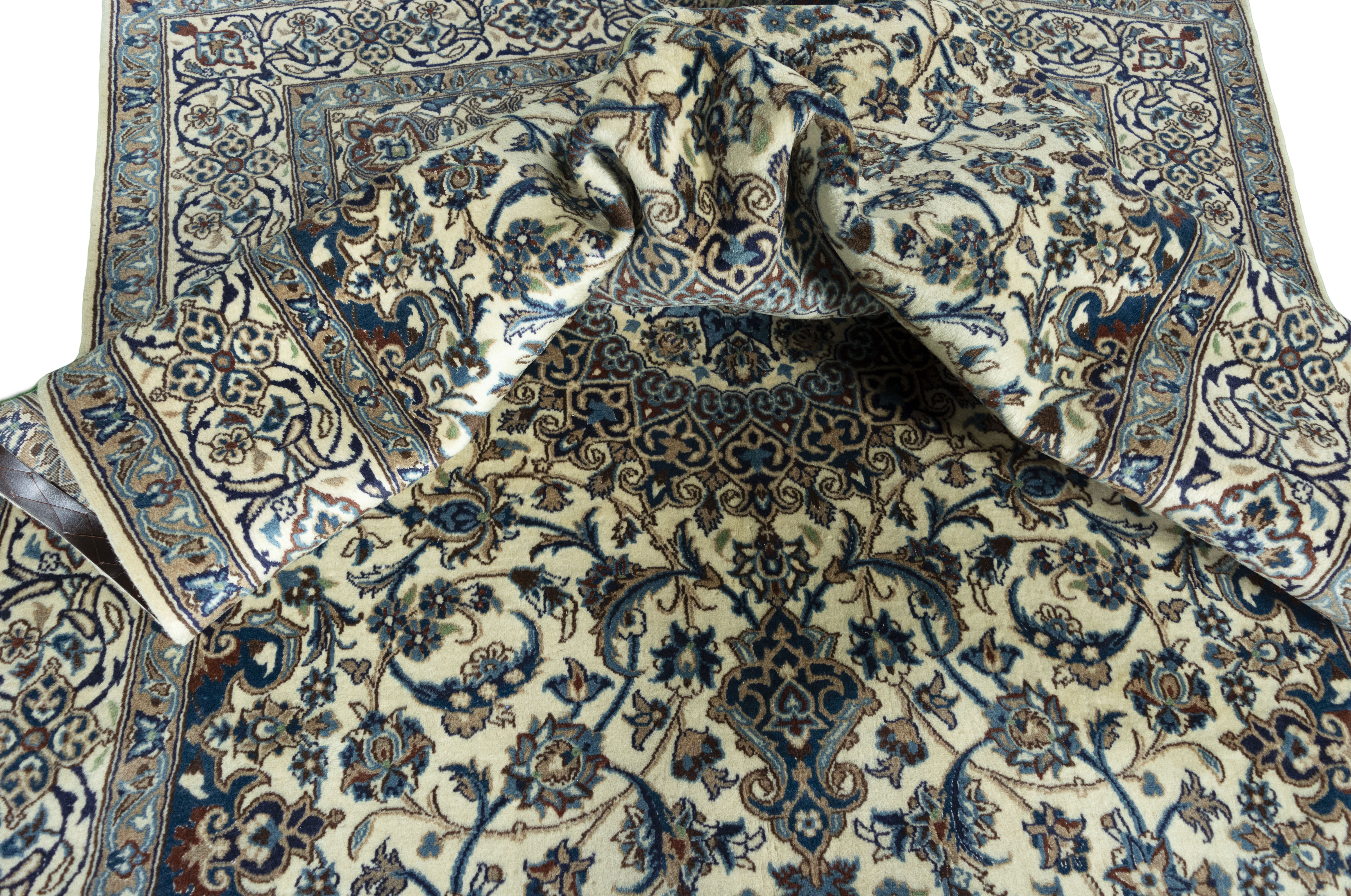 Nain Teppiche: Nain Teppiche entstammen der persischen Oasenstadt in der Provinz Isfahan. Die Stadt Nain ist weltweit bekannt für ihre Teppichknüpfereien und auch vielen Laien ein Begriff. Der unverwechselbare helle Grundton wird meistens mit einem kräftigen, königsblauen Ton kombiniert. Die Musterung der Teppiche reicht von klassischen floralen Motiven bis hin zu sehr ungewöhnlichen Neuinterpretationen andere persischer Muster. Durch seine Musterung, Farbwahl und Knüpfung ist der Nain Teppich ein besonders exklusiver Perserteppich, der Ihrer Einrichtung eine exklusive Note und einen echten Blickfang verleiht.