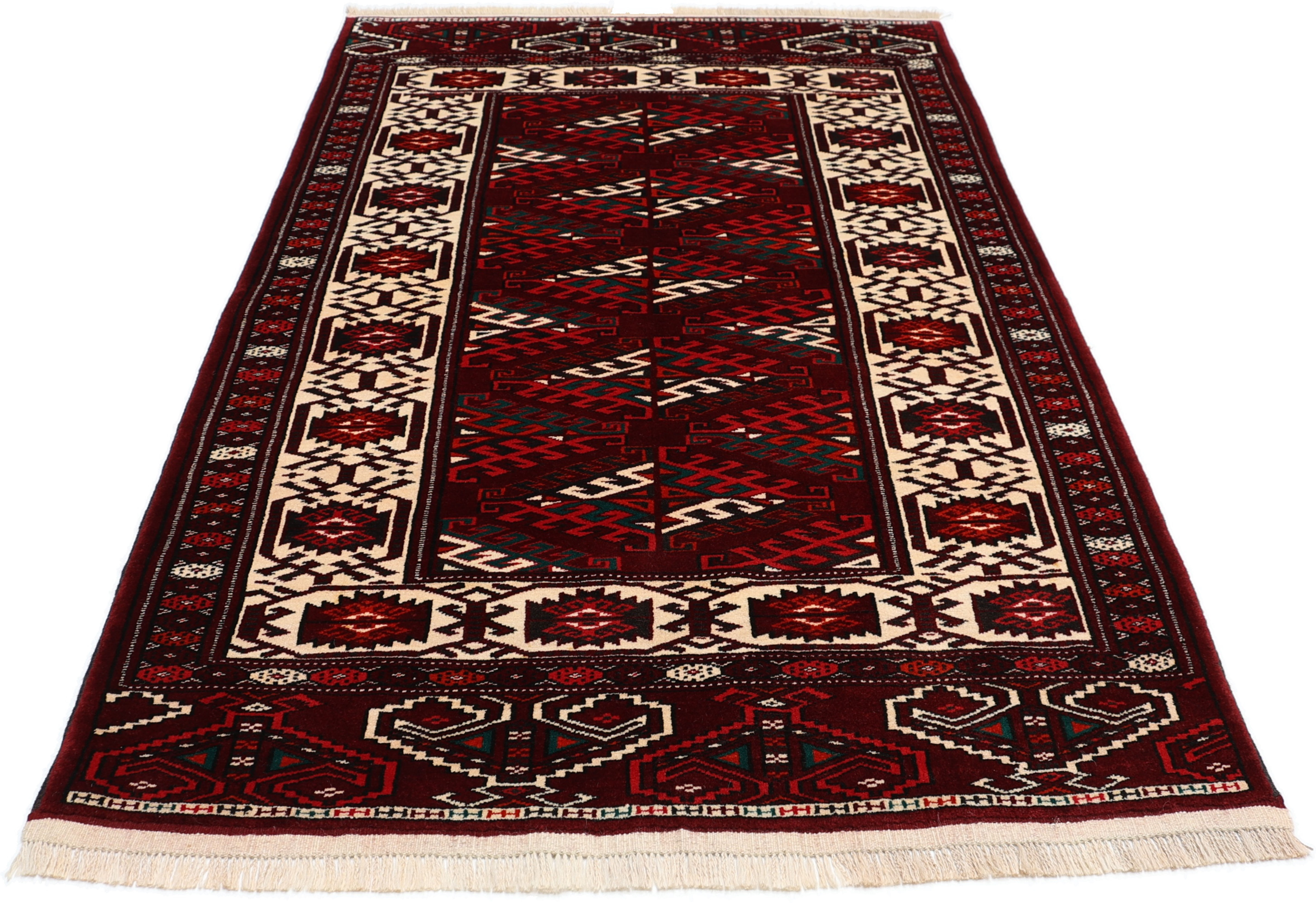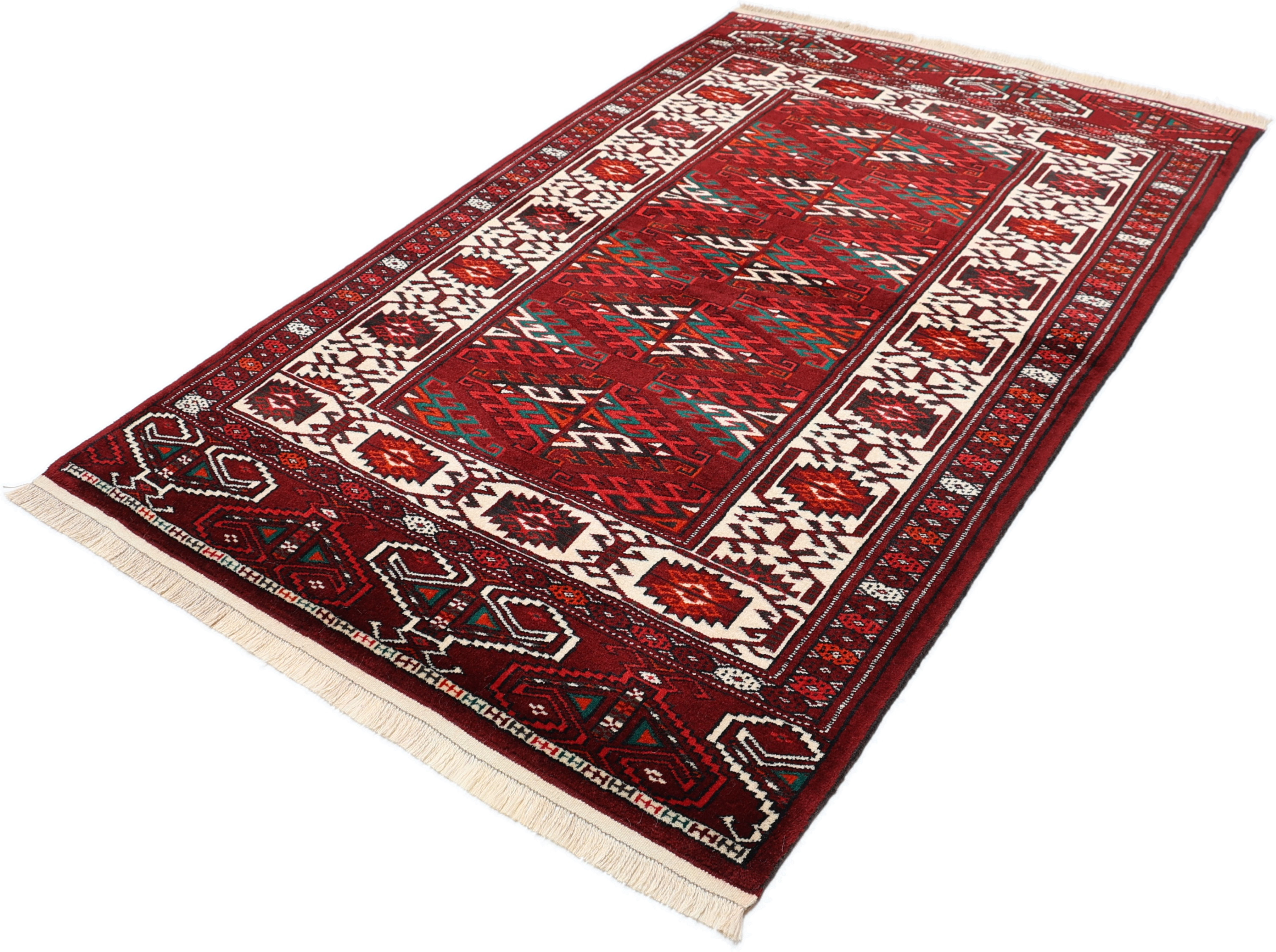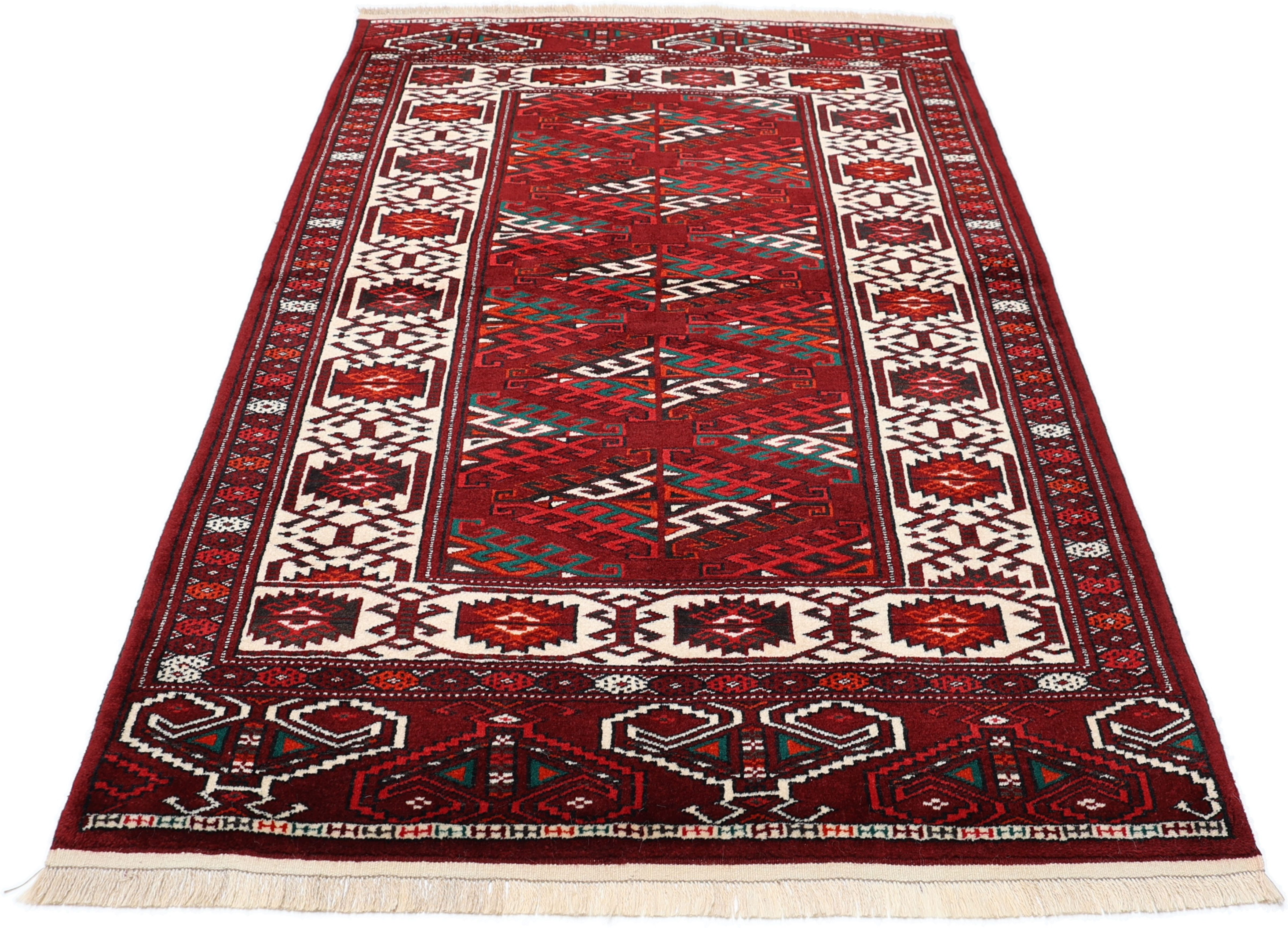 Turkmen Teppiche: Turkmen Teppiche werden vom Volksstamm der Turkmenen geknüpft. Die Turkmenen leben in einem Gebiet, dass sich von China über Afghanistan, Pakistan und dem Iran bis hin zur Türkei ausdehnt. Trotz der großen Streuung verstehen sich die Turkmenen immer noch als ein Volk. Auch ihre Teppiche haben mit diversen traditionellen Überlieferungen zum Zusammenhalt beigetragen. Grade bei Sammlern sind die Turkmen Teppiche deshalb sehr begehrt, da die Teppiche Zeugen der langen Geschichte dieses Volkes sind. Diese Teppiche sind daher für Geschichte- und Kulturliebhaber besonders interessant. Gerade zu älteren Turkmen Teppiche in unserem Sortiment können Sie gerne nach weiterführenden Informationen fragen.