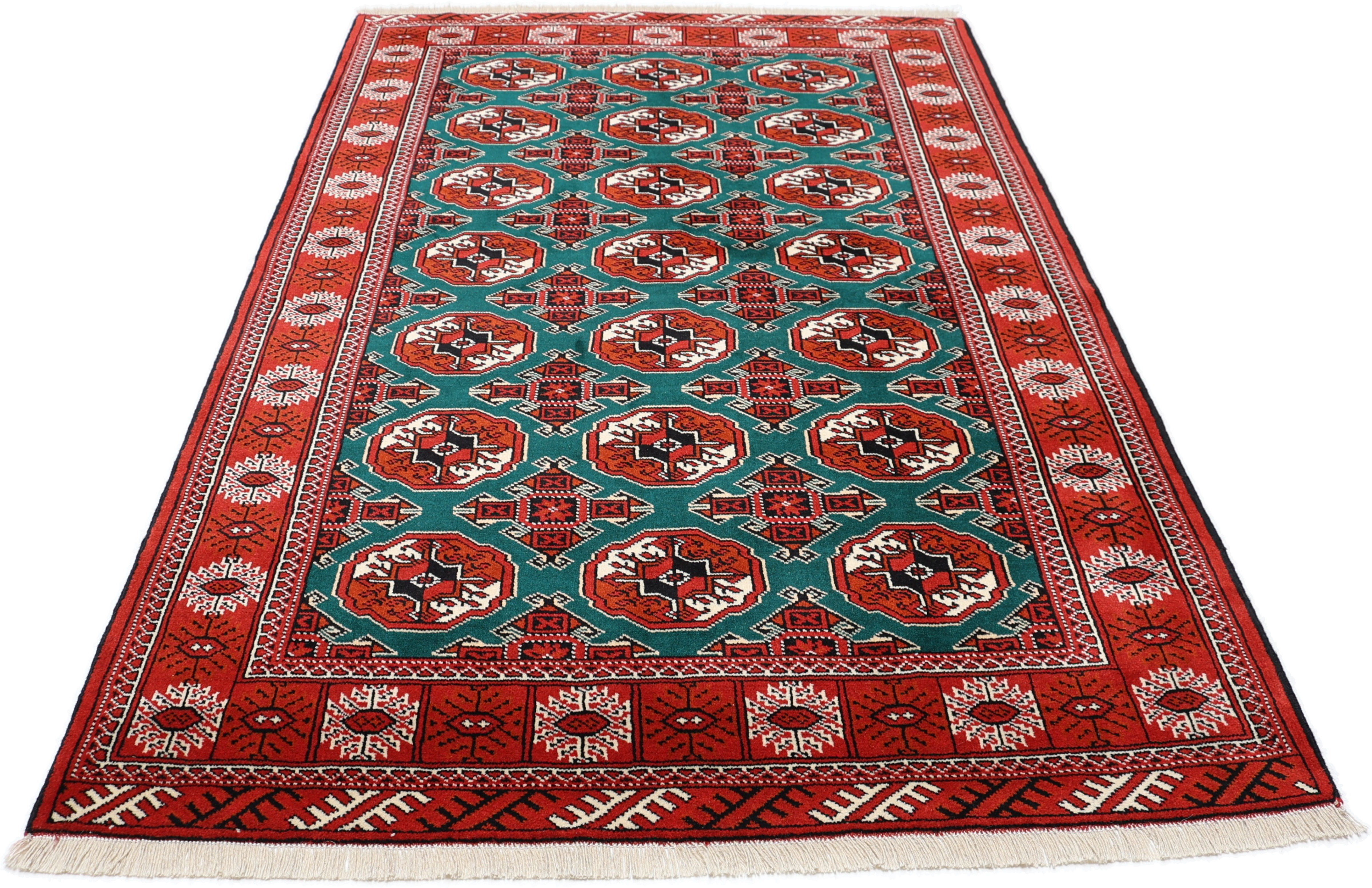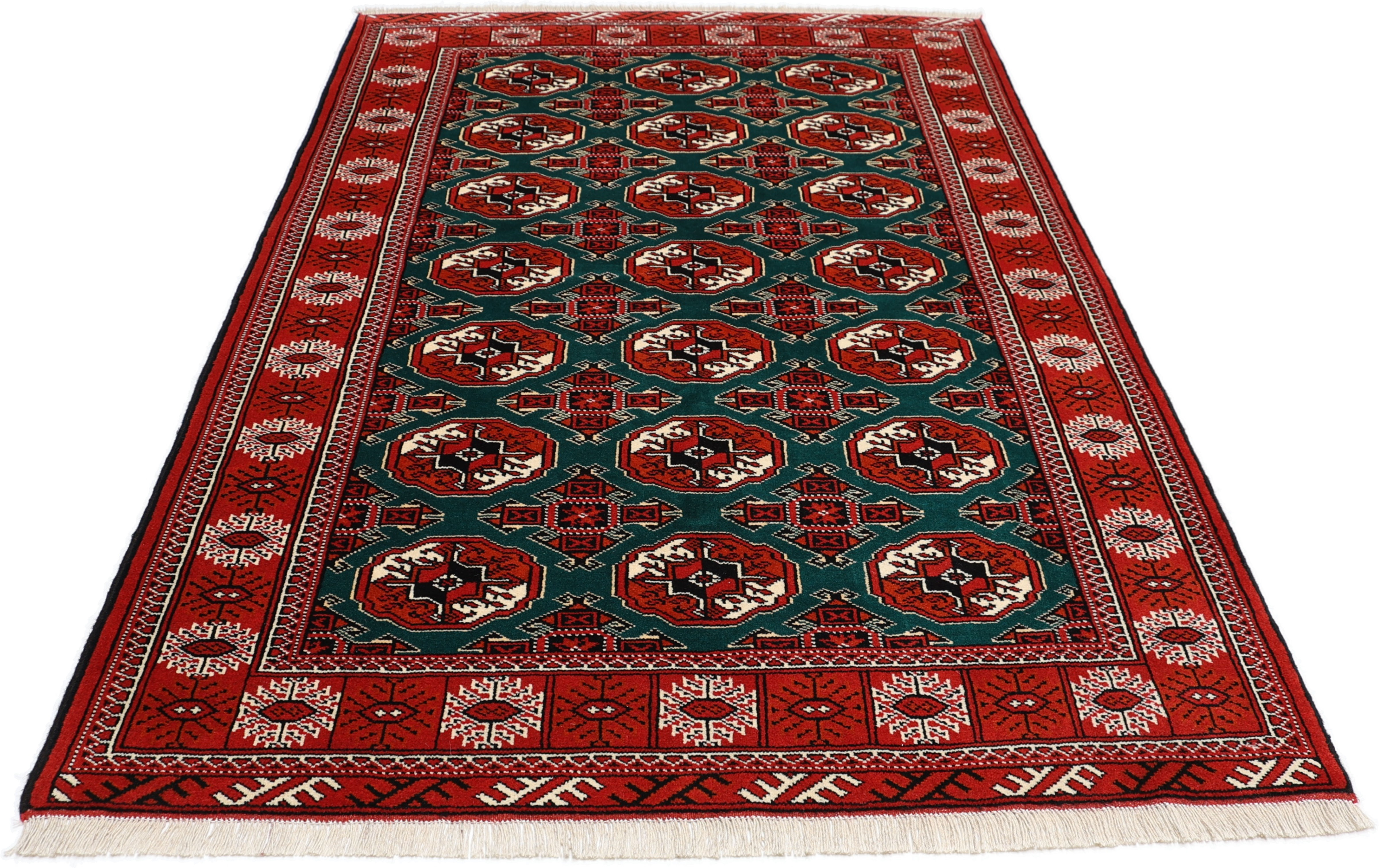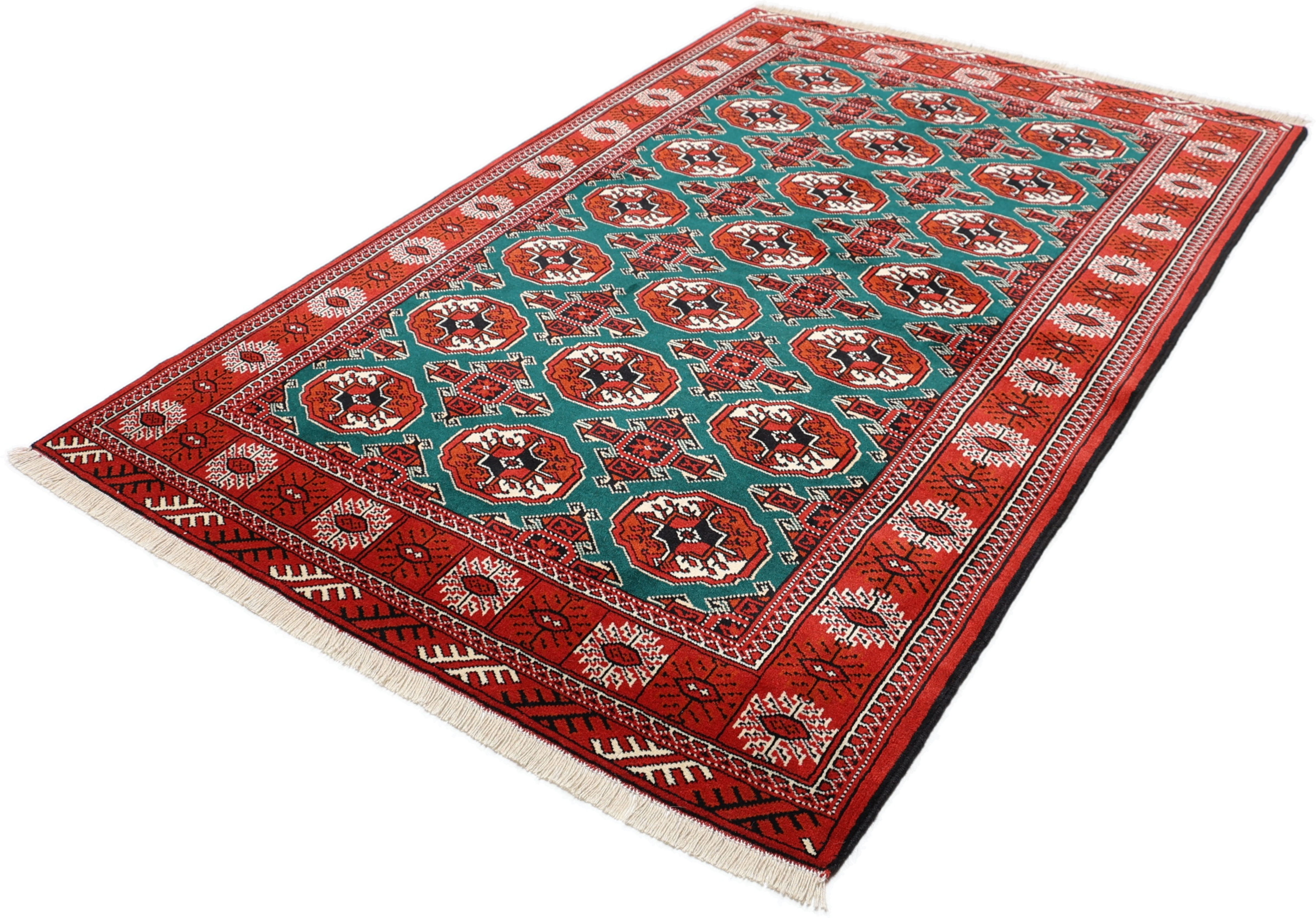 Turkmen Teppiche: Turkmen Teppiche werden vom Volksstamm der Turkmenen geknüpft. Die Turkmenen leben in einem Gebiet, dass sich von China über Afghanistan, Pakistan und dem Iran bis hin zur Türkei ausdehnt. Trotz der großen Streuung verstehen sich die Turkmenen immer noch als ein Volk. Auch ihre Teppiche haben mit diversen traditionellen Überlieferungen zum Zusammenhalt beigetragen. Grade bei Sammlern sind die Turkmen Teppiche deshalb sehr begehrt, da die Teppiche Zeugen der langen Geschichte dieses Volkes sind. Diese Teppiche sind daher für Geschichte- und Kulturliebhaber besonders interessant. Gerade zu älteren Turkmen Teppiche in unserem Sortiment können Sie gerne nach weiterführenden Informationen fragen.