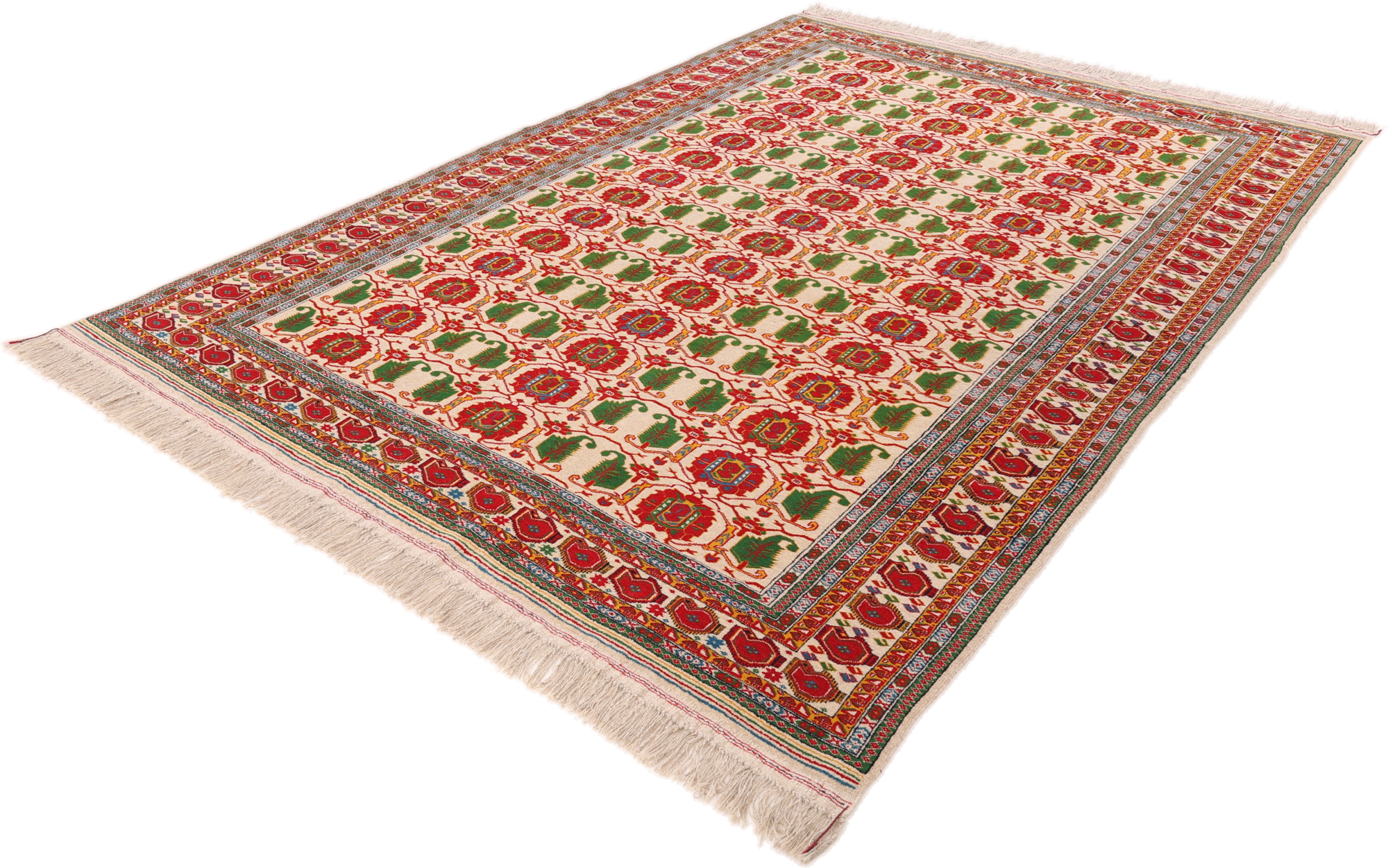 Turkmen Teppiche: Turkmen Teppiche werden vom Volksstamm der Turkmenen geknüpft. Die Turkmenen leben in einem Gebiet, dass sich von China über Afghanistan, Pakistan und dem Iran bis hin zur Türkei ausdehnt. Trotz der großen Streuung verstehen sich die Turkmenen immer noch als ein Volk. Auch ihre Teppiche haben mit diversen traditionellen Überlieferungen zum Zusammenhalt beigetragen. Grade bei Sammlern sind die Turkmen Teppiche deshalb sehr begehrt, da die Teppiche Zeugen der langen Geschichte dieses Volkes sind. Diese Teppiche sind daher für Geschichte- und Kulturliebhaber besonders interessant. Gerade zu älteren Turkmen Teppiche in unserem Sortiment können Sie gerne nach weiterführenden Informationen fragen.